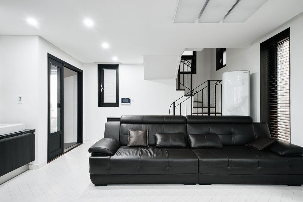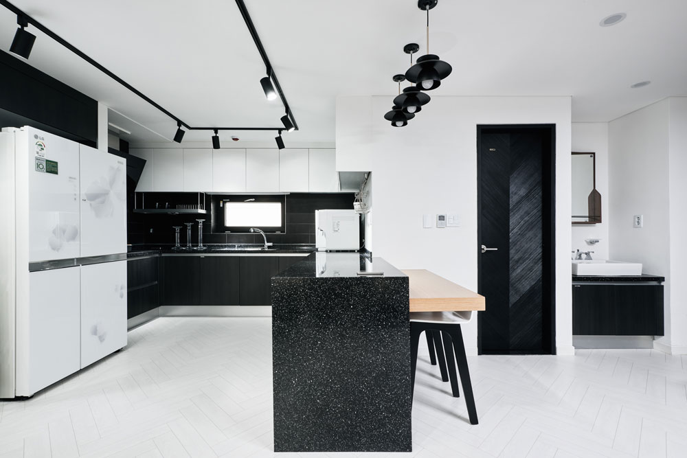 I started to create a design with the architectural philosophy of emptiness keeping the family’s wishes in mind. To break the stereotypical idea of a basement, 30% of the floor at the southwest side was emptied out to make an open space for ventilation and sunlight. It also gave the sense of consistency for the overall interior design. The balcony obtained by right to have sunlight was made of terraces looking over Yongma Mountain . All the rooms emphasize the modernity and simplicity through black and white and I tried to draw the context of the urban into the interior.
