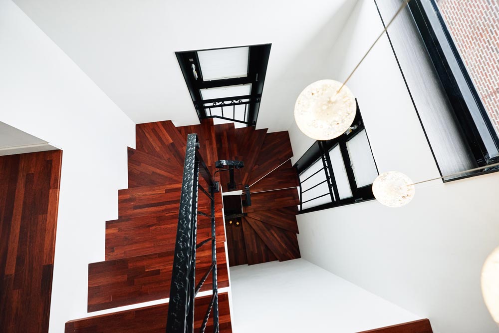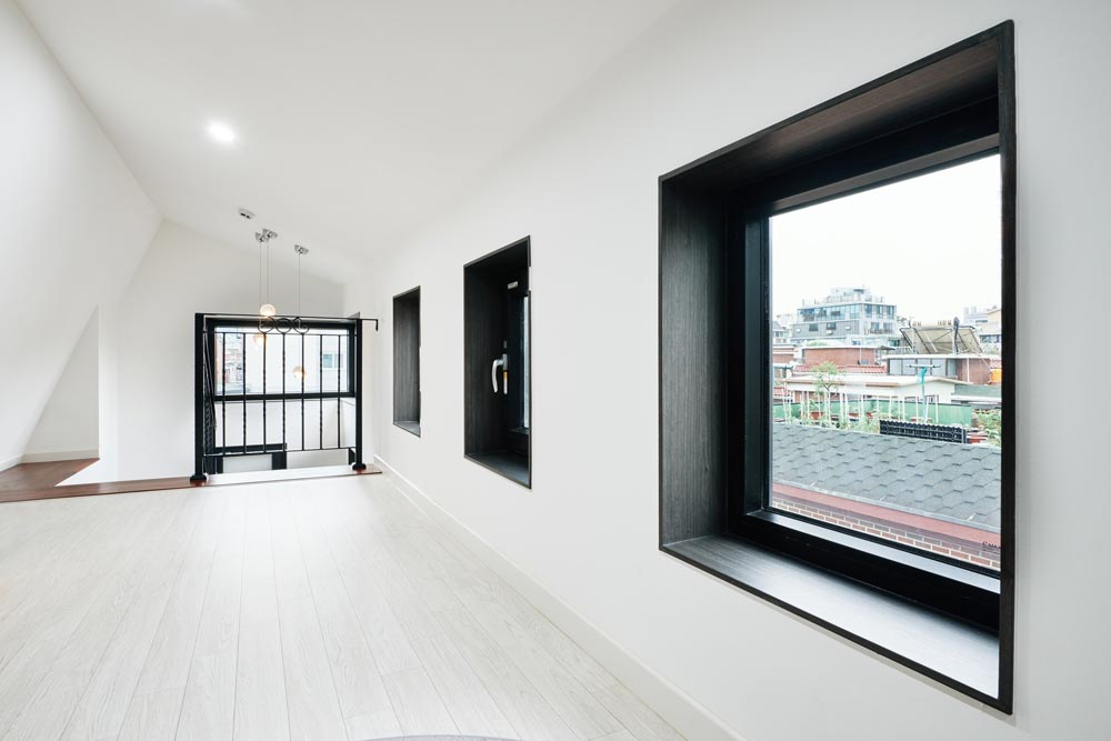 가족의 바람과 더불어 설계철학인 비움을 넣어 디자인을 완성해 나갔다. 1층 바닥의 30%를 비워 지하 의 채광과 환기는 물론 하나라는 일체감을 주는 공간으로 구성했다. 일조후퇴로 얻어진 자연발코니는 용마산을 품은 테라스로 만들어졌다. 모든 실내는 블랙과 화이트를 통한 모던하면서도 심플함을 강조 하여 도심의 맥락을 실내로 끌어들이려고 했다.