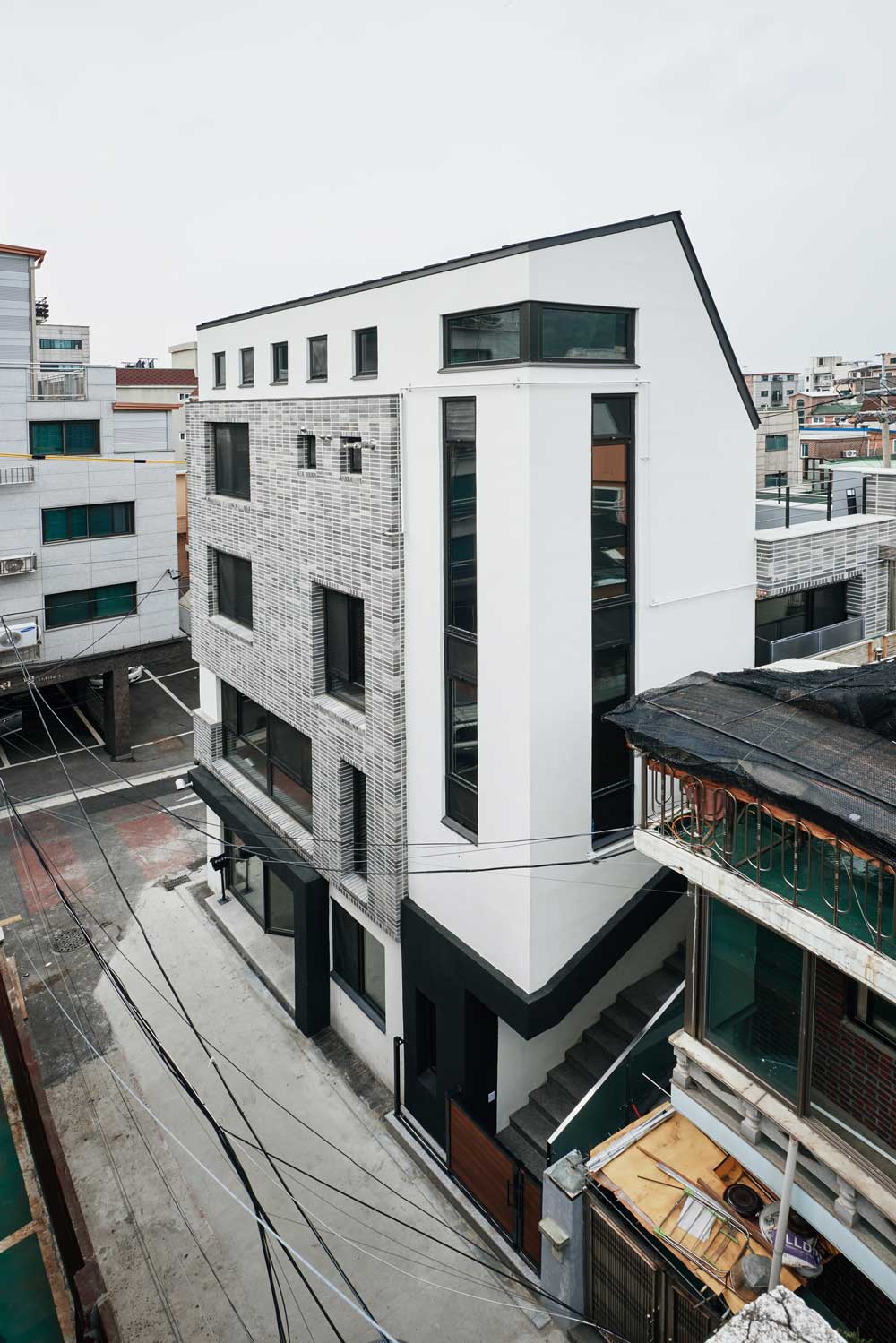 가족의 바람과 더불어 설계철학인 비움을 넣어 디자인을 완성해 나갔다. 1층 바닥의 30%를 비워 지하 의 채광과 환기는 물론 하나라는 일체감을 주는 공간으로 구성했다. 일조후퇴로 얻어진 자연발코니는 용마산을 품은 테라스로 만들어졌다. 모든 실내는 블랙과 화이트를 통한 모던하면서도 심플함을 강조 하여 도심의 맥락을 실내로 끌어들이려고 했다.
