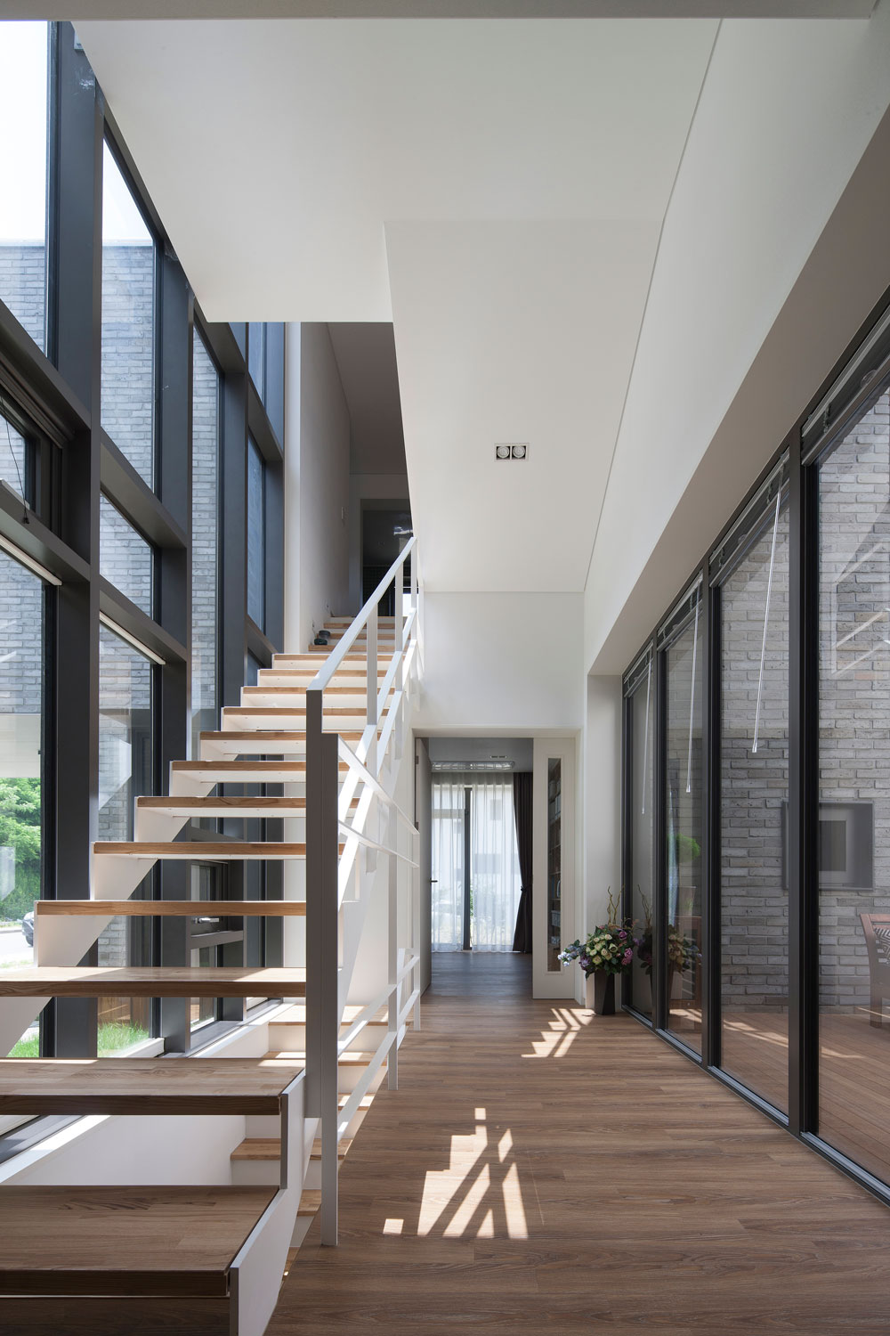 The husband's exercise room and the wife's work room are placed in the basement. Various hobbies and works can be undertaken in the house. The stairway which incorporates a bookcase was constructed as the space that escapes the daily life with the impression being similar to that of a small book cafe.