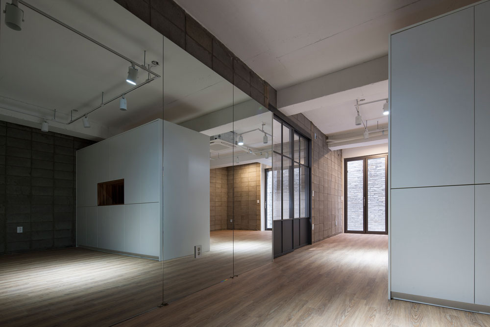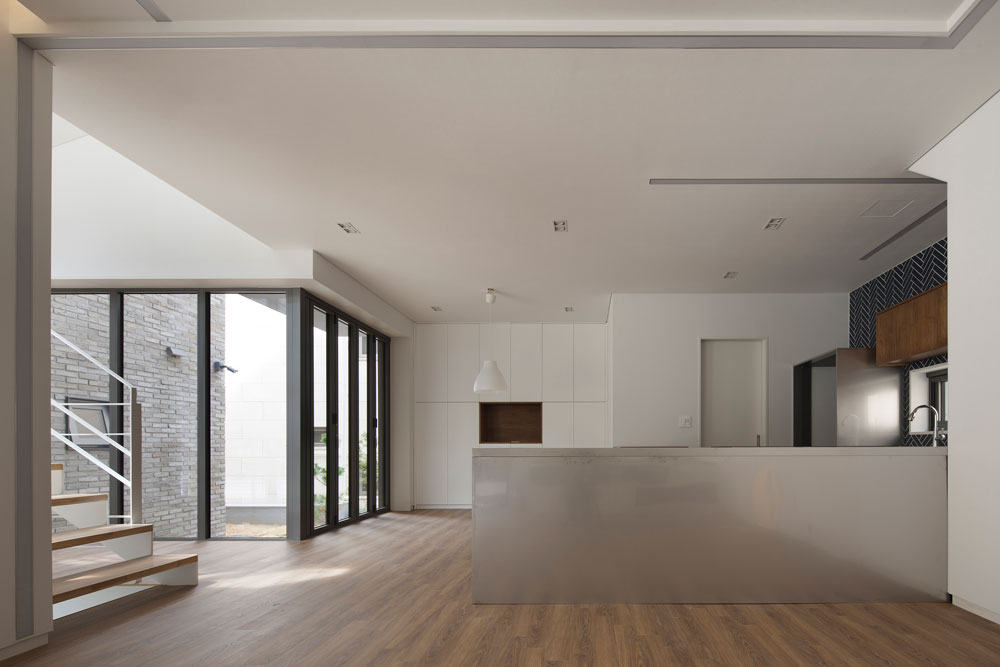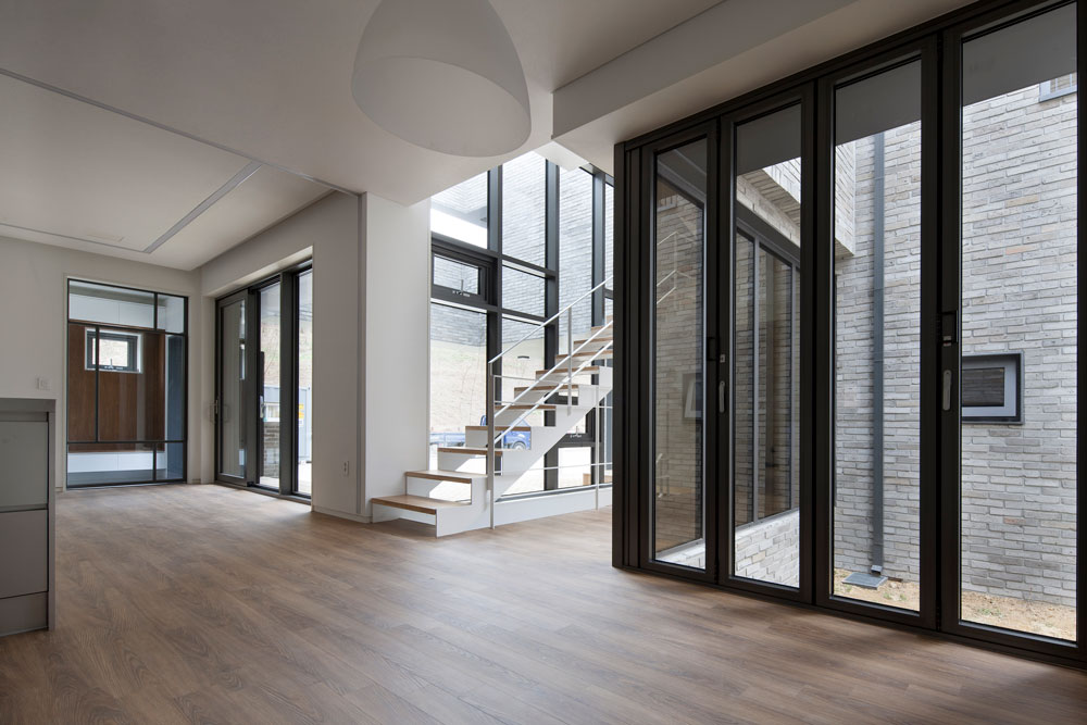The interior space was designed capable of observing the vertical landscape changes in the house according to the moving line that goes up and down the stairs. It is able to view the mountains beyond the yard at the living room, kitchen and dining room on the 1st floor, and to view the inner yard by projecting the middle stairway passageway mass at the yard of west restaurant. The stairway that goes up to the 2nd floor shows the compressed scenery through the frame of 2nd floor free-standing wall. On the roof terrace where goes up at last, the surrounding city landscape is viewed at a glance.
