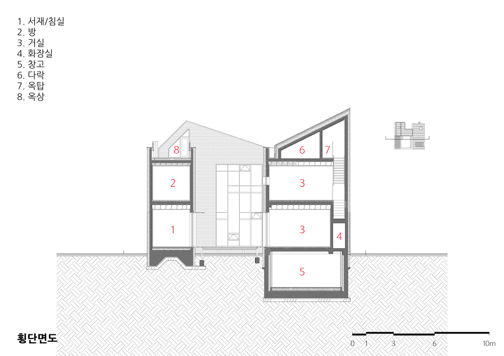 동쪽의 조망과 남쪽의 채광을 동시에 누리기 위해 우리는 북쪽과 남쪽에 매스를 나누고 가운데 를 연결하는 工 자형 배치했다. 工자 매스에 필지모양을 따라 2층 가벽을 새워 전체적으로 ㅁ자 형의 단순한 형태 속에 동서로 나눠진 두 개의 마당을 가진 형태로 설계했다. 가운데 연결된 매 스는 수직적인 연결의 계단을 두고 있고, 두 마당이 서로 시각적으로 투영되도록 유리로 마감을 하여 마당의 깊이감을 더한다.