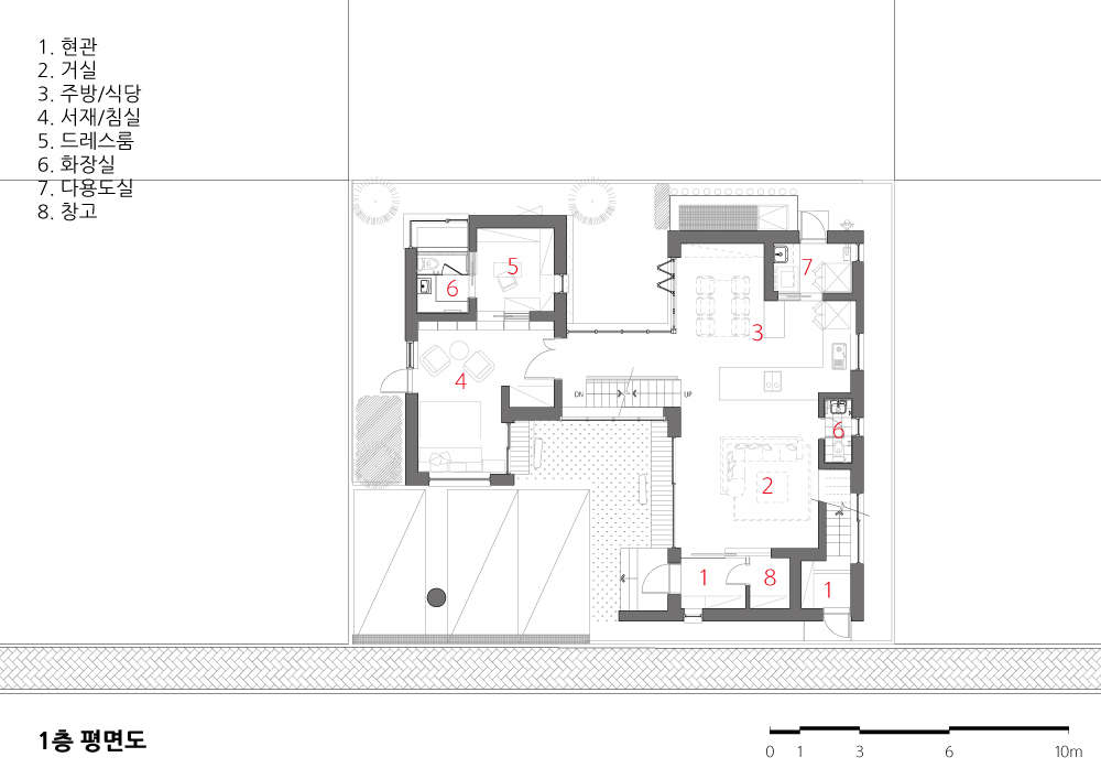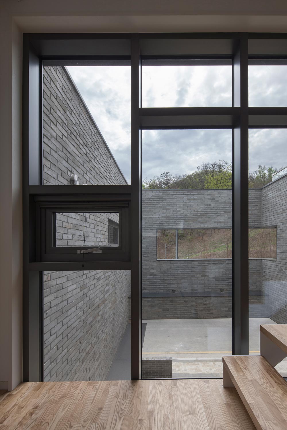 In order to take advantage of the eastern view and maximize the southern lightning we divided the structure at the north and south and deployed 工-typed connecting the center. It was designed so that there were two yards, which were divided into east and west in the ㅁtyped simple shape totally by setting up the 2nd floor free-standing wall along the land shape in the 工typed mass. As the masses that the centers were connected have a vertical connection stairs and finished with glass to be projected visually the 2 yards each other, it could add the depth of yards.