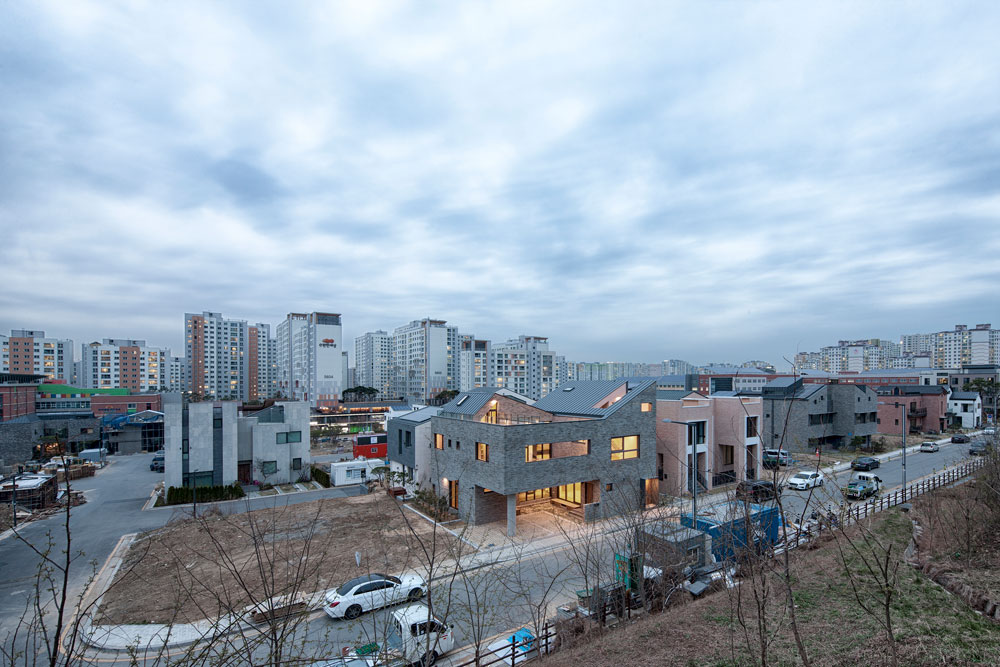 The interior space was designed capable of observing the vertical landscape changes in the house according to the moving line that goes up and down the stairs. It is able to view the mountains beyond the yard at the living room, kitchen and dining room on the 1st floor, and to view the inner yard by projecting the middle stairway passageway mass at the yard of west restaurant. The stairway that goes up to the 2nd floor shows the compressed scenery through the frame of 2nd floor free-standing wall. On the roof terrace where goes up at last, the surrounding city landscape is viewed at a glance.