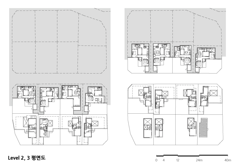 즉, 건축주들의 가족구성과 경제력, 개별적인 요구조건 등에 맞추어 하나 하나 독자적인 평면과 면적으로 지어진 단독주택 마흔한채!
