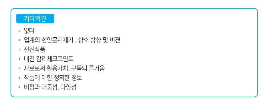 ▹ 일반인도 정기구독을 희망할 정도로 매력있는 잡지가 되었으면 좋겠다. 매월 책 펴내느라 정말 수고가 많다. 항상 응원하고 있다.