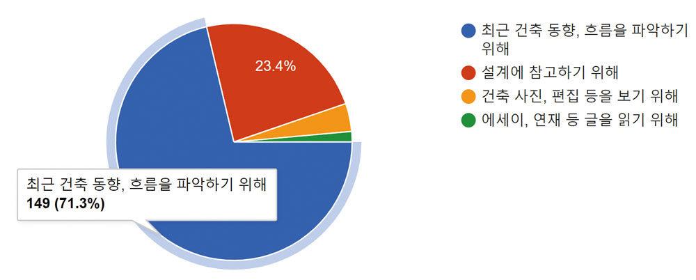 구독하는 건축잡지가 있는지 묻는 질문에 응답자 중 46.9%가 ‘있다’고 응답했다. 구독하는 잡지가 있 다는 응답자를 대상으로 건축잡지의 구독 이유를 묻기도 했다. 그중 71.3%가 ‘최근 건축 동향과 흐름 을 파악하기 위해’로 나타났다. 이는 ‘설계에 참고하기 위해(23.4%)’, ‘사진, 편집 등을 보기 위해(3.8%)’, ‘에세이, 연재 등 글을 읽기 위해(1.4%)’보다 월등히 높은 수치이다. 이러한 건축잡지 구독자들은 83.7% 가 ‘국내잡지’를 구독중인 것으로 나타났으며, 주로 ‘필요한 정보만 발췌(76.1%)’한다고 응답했다.