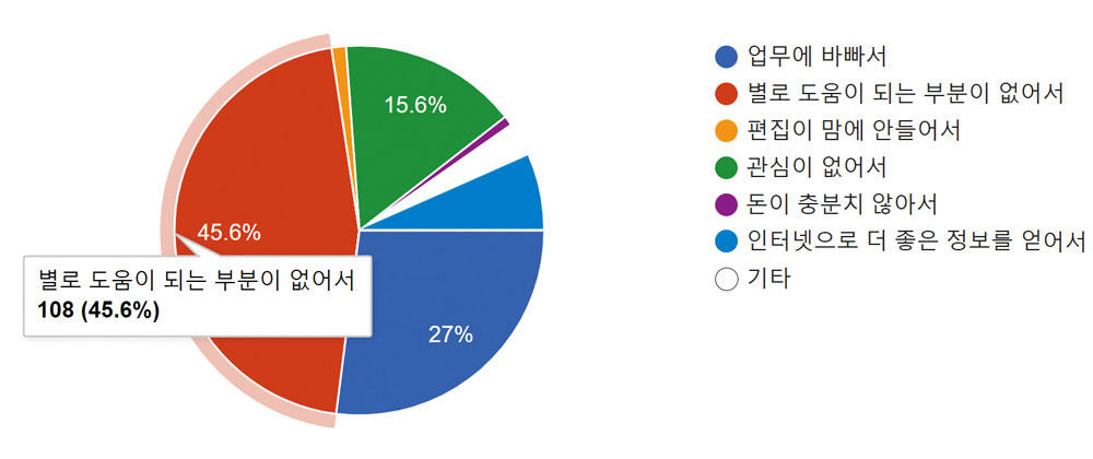 반면, 구독하고 있는 잡지가 없다는 응답자는 53.1%로 설문조사 참가자의 과반수를 넘는 수치가 나 타났다. 이유를 물어본 결과 ‘별로 도움이 되는 부분이 없다고 생각’한다는 대답이 45.6%로 나타났 으며 외에도 ‘업무에 바빠서(27%)’, ‘관심이 없어서(15.6%)’, ‘인터넷에 더 좋은 정보가 많다고 생각해 서(5.1%)’, ‘경제적인 여유가 없어서(1.7%)’등의 이유로 구독을 하지 않는다고 밝혔다.