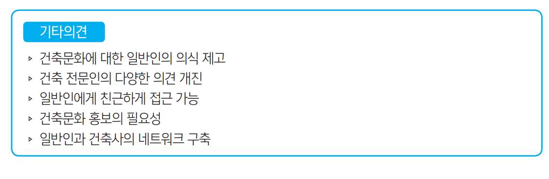 ▹ 건축의 뉴스라든지 동향은 건축사들만이 본다면 아무런 의미가 없다. 일반 대중들이 알 수 있도록 적 극 홍보해야 한다고 생각한다.