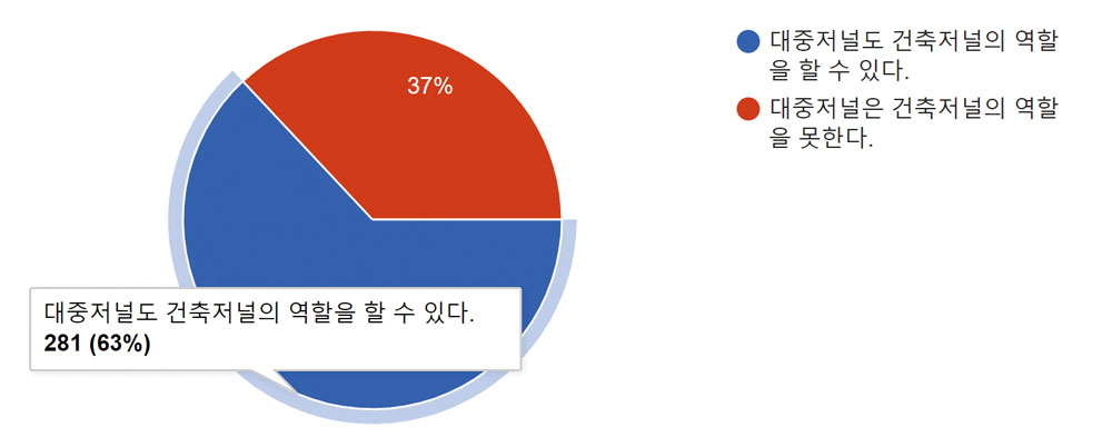 건축저널의 대안으로 ‘전원속의 내집’, ‘행복이 가득한 집’ 등 대중저널이 역할을 수행할 수 있냐고 묻는 질문에 과반수가 넘는 63%가 ‘할 수 있다’고 답했다. 건축저널이 필요한 이유를 묻는 질문에는 ‘건축계 동향(36.2%)’, ‘작품소개(32.3%)’, ‘건축담론 또는 비평 등(27.6%)’을 꼽았으며, 기타의견으로 ‘일반인과의 네트워크 구축, 일반인에게 친근하게 다가갈 수 있다’ 등이 제시됐다.