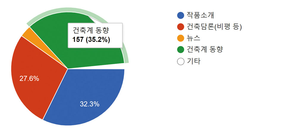 ▹ 다양한 작품과 건축계 다양한 소식이 게재돼야 한다. 신속한 보도, 공정성, 공평, 공리에 적용한 정보제 공과 건축 지표대안이 필요하다.