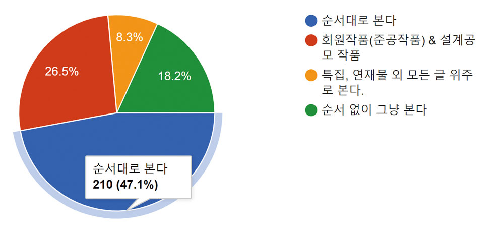 구독하는 건축잡지가 있는지 묻는 질문에 응답자 중 46.9%가 ‘있다’고 응답했다. 구독하는 잡지가 있 다는 응답자를 대상으로 건축잡지의 구독 이유를 묻기도 했다. 그중 71.3%가 ‘최근 건축 동향과 흐름 을 파악하기 위해’로 나타났다. 이는 ‘설계에 참고하기 위해(23.4%)’, ‘사진, 편집 등을 보기 위해(3.8%)’, ‘에세이, 연재 등 글을 읽기 위해(1.4%)’보다 월등히 높은 수치이다. 이러한 건축잡지 구독자들은 83.7% 가 ‘국내잡지’를 구독중인 것으로 나타났으며, 주로 ‘필요한 정보만 발췌(76.1%)’한다고 응답했다.