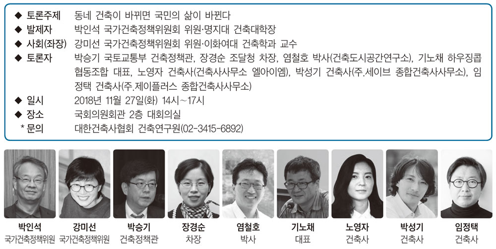 대한건축사협회를 비롯한 건축계3단체는 민간건 축 다양한 주체들을 초청해 ‘2018년 건축 대국민 토론회’를 개최한다. 본 토론회는 국회 국토교통 위원장, 국가건축정책위원회, 한국건축가협회, 새건축사협의회, 대한건축사협회가 뜻을 같이 해 공동주최하고, 대한건축사협회가 주관한다. 문재인 대통령은 지난 9월 4일 ‘대한민국 생활 SOC 현장방문 - 동네건축 현장을 가다’ 행사에 참석해 생활SOC에 대한 투자 확대 의지를 표명 하며, 이와 더불어 질적 혁신을 병행해 국민들의 삶의 질을 향상시킬 수 있는 제대로 된 지역밀착 형 생활SOC가 공급될 필요가 있다는 데 의견을 함께 했다. 주민생활과 밀접한 도서관, 경로당, 어 린이집 등을 ‘생활SOC'라 지칭하며, 내년도 정부 예산 8조7천억 원에 더해 지자체 매칭 투자까지 총 12조원을 투자하겠다고 밝혔다. 그동안 펼쳐 온 대규모SOC 위주 정책에서 일상에 필요한 생 활기반 시설을 확충하는 정책기조로 바꾼다는 계획이다.