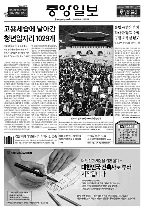 광고에는 “1만 5천명 대한민국건축사, 그리고 대한건축 사협회와 전국 17개 시도건축사회는 국민의 안전과 생명 을 지키고 행복한 삶을 설계하는 사회공공적 의무와 역 할을 다하기로 다짐합니다”라는 문구가 실렸다.