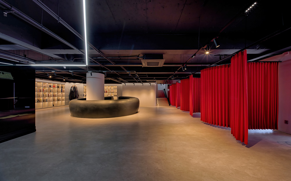 Youngmi Woo, whom I first met in 1998, did not have a preference for red. She did, however, as time went on became a supporter of the most powerful collar choice for this project. She even made and used Youngmi Woo's red for her projects, and she worked on it. Perhaps the various metaphors and connotations of ‘Red’ stimulated the energy of a fashion designer for 40 years. ‘Red’ used in the architecture and interior was sampled several times and few among it were selected. In particular, Metalic Red used for the exterior of the building revealed a different emotional color each time by the ever-changing sunlight. The achromatic colors used throughout the architecture and interior are supporter colors that support Red, and the texture is also carefully selected. The smooth metal red louver was used over rough asphalt and concrete. The red curtain with a rough texture is used with interior materials with a medium texture.