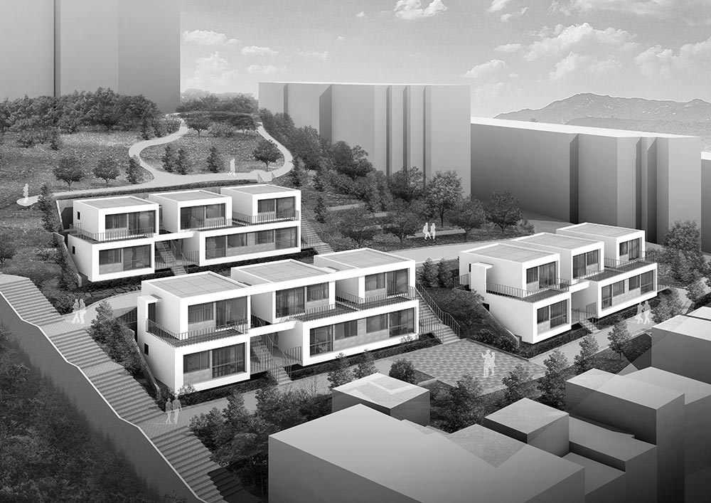 It provides space (access yard, entrance, view) that can be applied to the most favored small dwellings and overcome the limit of small houses. Since the whole land is composed of a slope, it is divided into three stages; residential buildings are placed to secure the view without obstructing sight lines. Also, the central plaza, which is an open space, is placed between the residential buildings to maintain privacy between them while forming community through communication with residents.