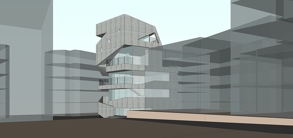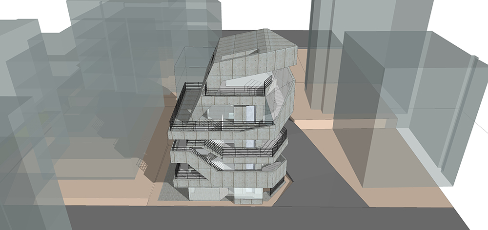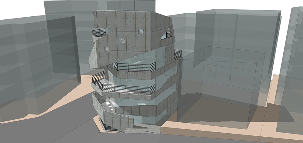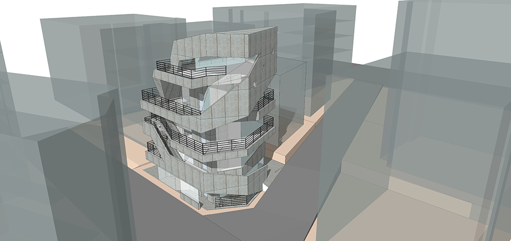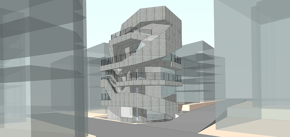 가로수 길은 길을 따라 상업공간이 연속되어 있어 거리를 거닐면서 상행위가 이루어 지는 특징 을 하고 있다. 우리는 이러한 상업적 거리를 건축의 입면화로 계획 하고자 했다. 상업적 거리를 건물의 수직 동선으로 이으면서 계단의 동선이 건물 외벽을 감아 오르는 형태로 건축은 입면화 하고 있다. 이러한 형태는 동선의 비워진 라인이 건물 전체를 휘감는 형태로 사람들의 상행위 움직임과 함께 역동적인 입면이 되는 것이다. 이러한 모습은 시간에 따라 다양한 모습으로 사람 과 공간이 어울어지는 모습을 연출하게 될 것이다.