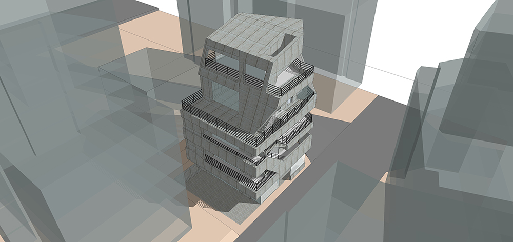 임대료가 높은 상업공간은 법적으로 주어진 건폐율과 용적률 내에서 최대한의 공간을 확보하는 발코니형식으로 면적을 확보하고 있다. 또한 북측일조 사선으로 생기는 4층과 5층 테라스도 공 간의 확장으로 사용 하고 있다. 이처럼 용적의 활용여지가 없는 상업건축의 형태는 어떤 모습으 로 주변환경과 관계를 조직할 수 있을까?
