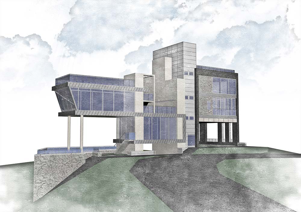 지하는 그들의 주택, 1층은 소매점과 작은 전망대, 2층은 소매점과 휴게음식점, 중간의 전망대, 그리고 지붕은 커다란 전망대로 계획했다.