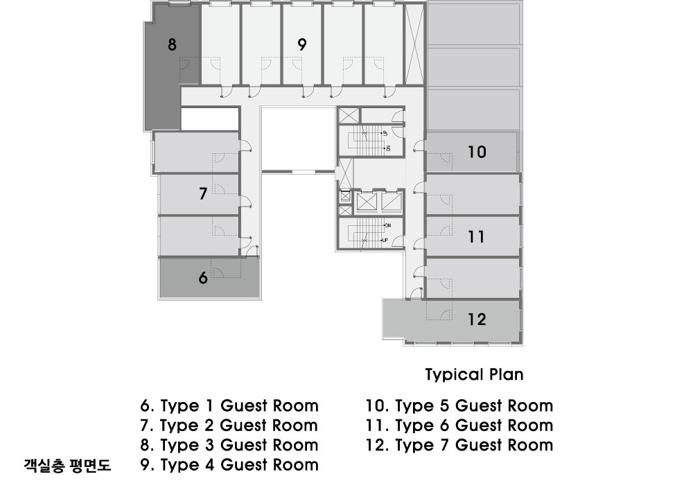 Hotel Gangneung Architect | Roh, Hwi _ DiDi STUDIO Architecture Client | Dongtak Project team | Kim, Taehyung · Kwon, Dowan · Lee, Kangguk Location | 302-3, Gangmun-dong, Gangneung-si, Gangwon-do, Korea Program | Accommodation Site area | 1320.80㎡ Building area | 724.24㎡ Gross floor area | 3,821.14㎡ Building to land ratio | 54.83% Floor area ratio | 199.95% Building scope | B1F - 7F Structure | RC Exterior finishing | Lime stone Interior finishing | Marble Design period | Jun. 2015 ~ Mar. 2016 |