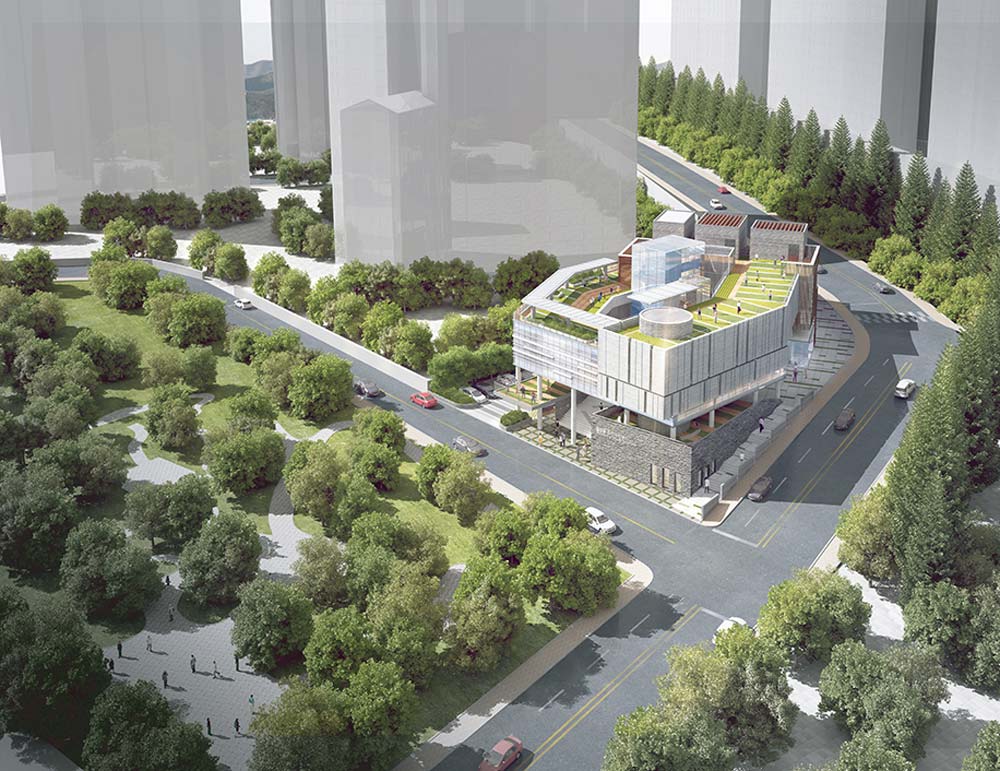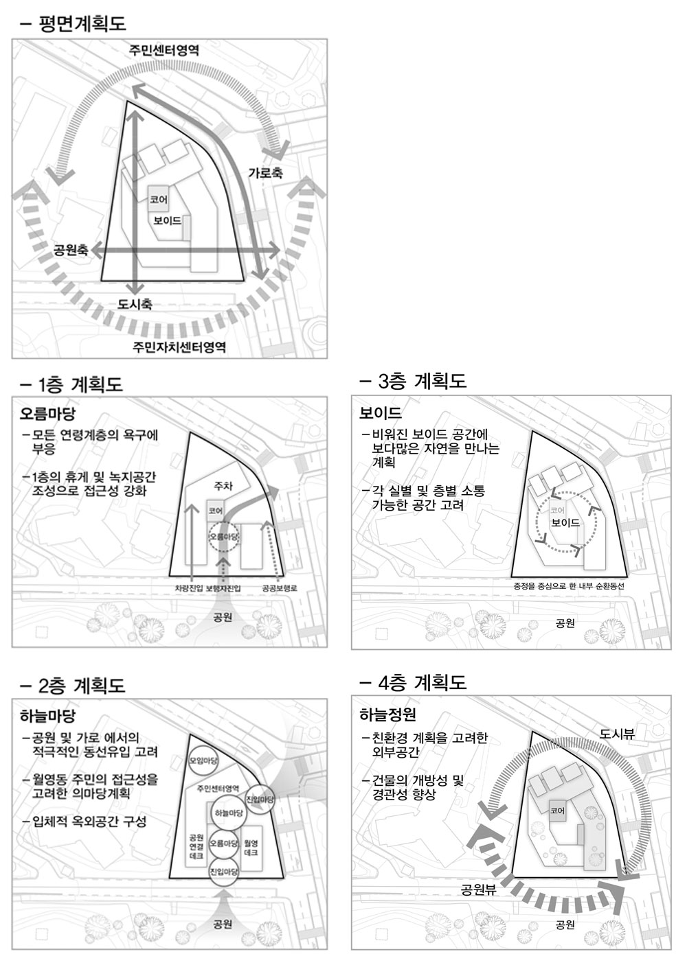 지상 2층의 외부 공간은 광장의 중심적인 역할을 하고 공원과 연계된 외부계단은 다양한 이벤 트를 수용하는 다목적계단으로 계획했다. 상부 건물의 중정형 배치는 사방으로 열려 혼잡할 수 있는 광장에 중심성을 제공하여 질서를 부여하는 건축적 장치이며, 지상 3층의 주민자치센터공 간을 순환할 수 있게 하여 주민들의 적극적인 만남을 유도했다.