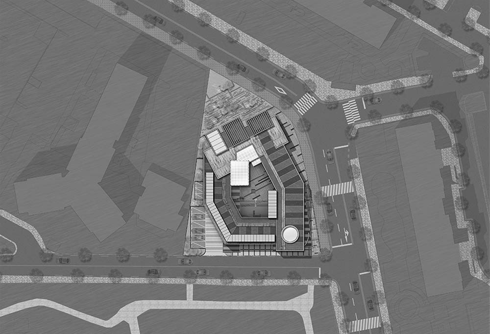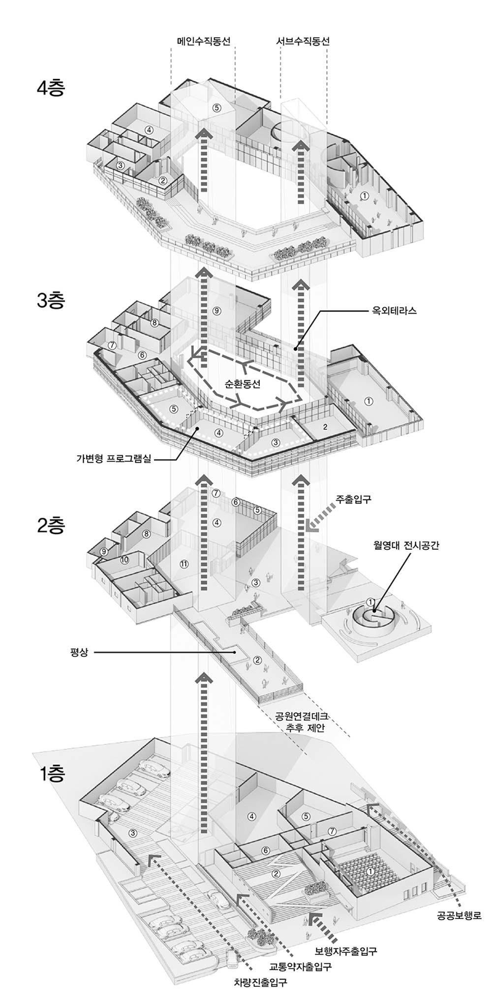 지상 2층의 외부 공간은 광장의 중심적인 역할을 하고 공원과 연계된 외부계단은 다양한 이벤 트를 수용하는 다목적계단으로 계획했다. 상부 건물의 중정형 배치는 사방으로 열려 혼잡할 수 있는 광장에 중심성을 제공하여 질서를 부여하는 건축적 장치이며, 지상 3층의 주민자치센터공 간을 순환할 수 있게 하여 주민들의 적극적인 만남을 유도했다.