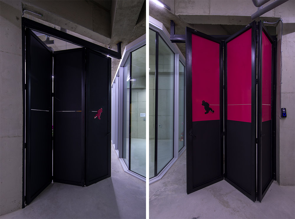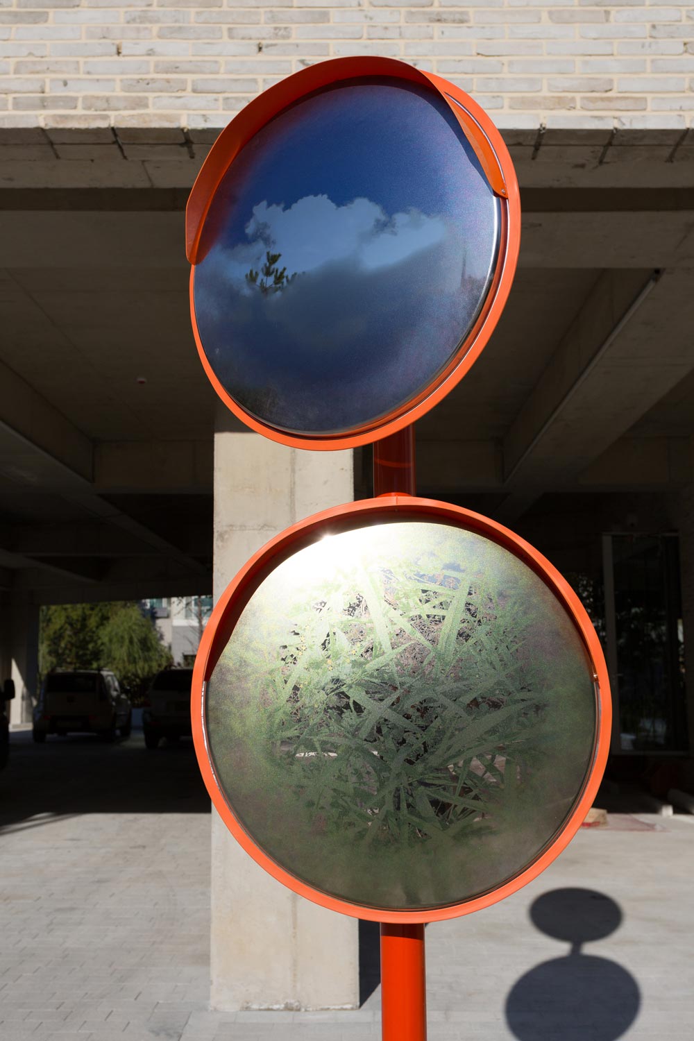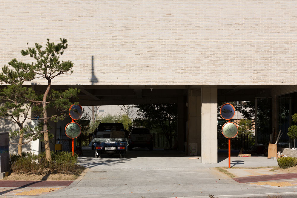 주차장 입구에는 스테인리스 거울들이 달려 있는 두개의 기둥이 세워져 있는데 그 기둥들은 마치 수호신의 눈처럼 관객들을 맞이하게 된다. 이 설치작품에서 관 객들은 자기 자신을 발견하게 될 것이다. 여기서 관객들의 수호신(Guardians)은 자연이다. 오브제는 매우 흔하고 일상적인 형태를 갖고 있지만 이들 주변을 반영 하고 있는 투명한 이미지들은 관객과의 대화를 이끌어낸다. 각각의 기둥에는 두 개씩 스테인리스 거울이 달려 있는데, 그 중 하나는 하늘의 이미지를 담고 있고 또 다른 하나는 한국 땅의 이미지를 담고 있다. 각 이미지들이 가지고 있는 흰색 톤은 투명하게 만들어지는데, 이를 통해 여기에 투영되는 이미지는 그 이미지의 일부분 이 되고 이로써 현실과 이미지가 혼재하게 된다.