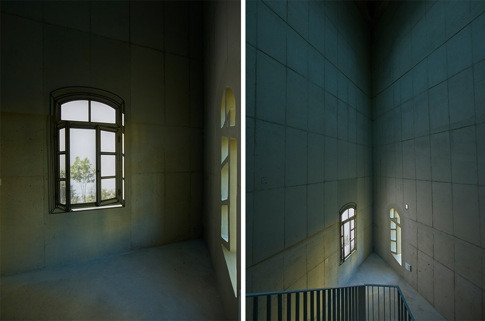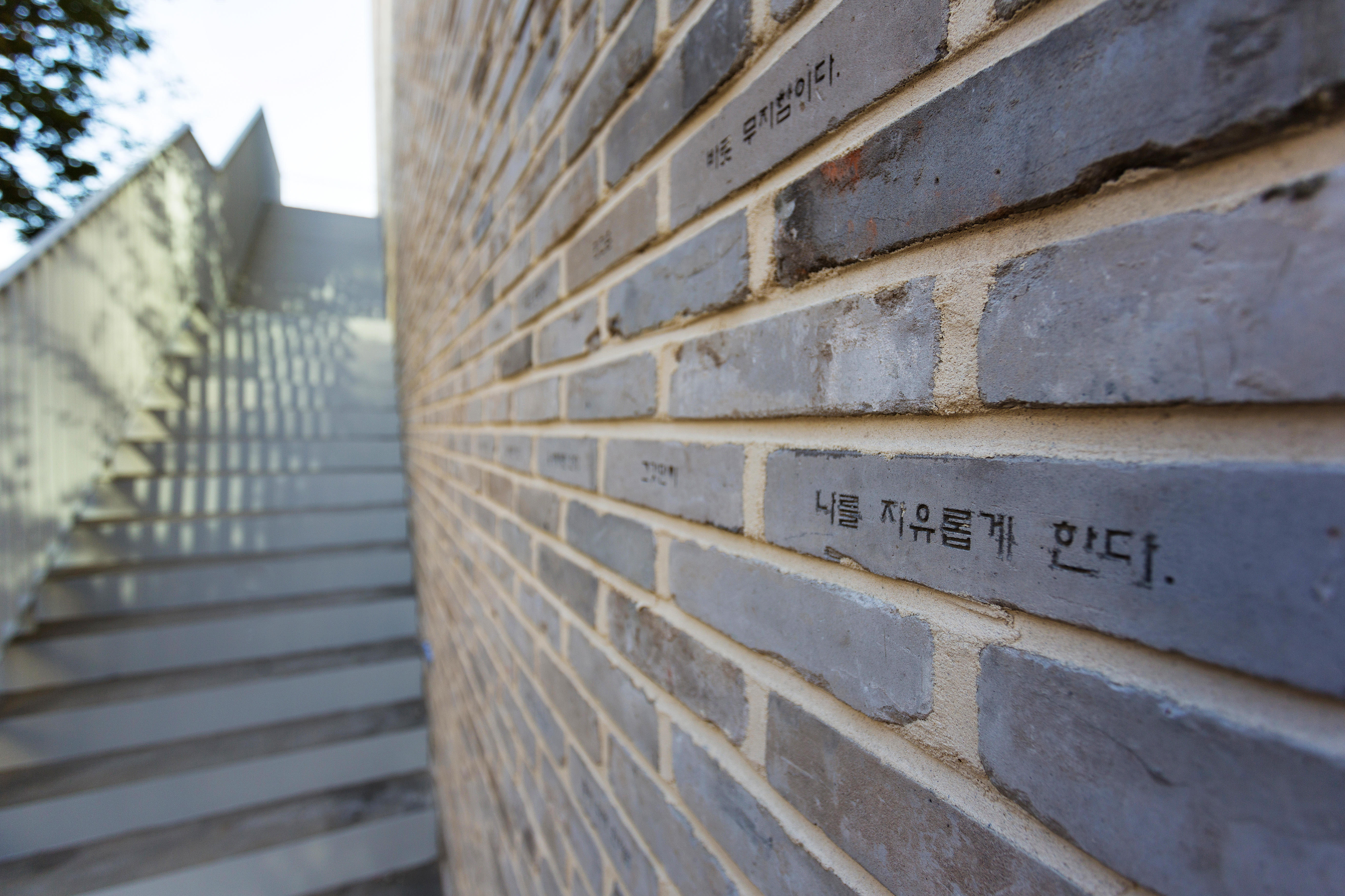 미술관 벽에 많은 문장을 새겨 넣었다. 문장들은 그동안 생각해 왔던 예술가의 삶 의 태도, 작업의 의미에 대한 것으로 작업을 하면서 느꼈던 나의 생각과 일치하는 문장들을 찾았다. 어찌 생각하면 새긴다는 말처럼 위험한 것은 없다. 하지만 자기 만의 철학으로 개성 있는 세계를 만드는 작가들의 말이나 생각을 짧은 문장으로 읽을 수 있다는 것은 매우 흥미로울 뿐만 아니라 오히려 삶에 대한 질문을 받을지 도 모른다. 삶과 작품이 일치까지는 아니어도 닮았으면 좋겠다는 생각을 하면서 작품을 마무리 했다. 건물 뒤편 산책로에서 올라가는 계단 외벽에 설치된 작품 < 말의 풍경>은 창작과 관련된 글귀들을 발췌해서 1층에서 3층 사이의 벽에 설치 된다. 관람객들이 자연스럽게 볼 수 있는 위치에 배치하도록 하되 그 외에도 수 없 이 많은 문장들이 벽에 새겨질 가능성을 보여주기 위해서 문장들이 퍼지는 느낌으 로 배치하도록 했다. 벽에 새겨진 문장들은 때로는 무의미하게 벽을 장식하는 느 낌으로 보일 수도 있지만 어느 날 문득 새겨진 문장들을 보면서 어떤 질문이나 생 각을 유도할 수 있지 않을까 하는 생각으로 작업에 임했다.