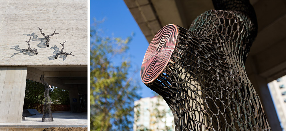 소나무는 우리나라 산천 어디에서도 볼 수 있는 친근한 자연의 얼굴이다. 특히 척 박한 땅에서도 왕성한 생명력을 자랑하는 소나무는 가장 근원적인 형태이자 상징 적 인식의 자연물이라 할 수 있다. 이러한 소나무의 강한 생명력에서 모티프를 얻 어 제작된 본 작품은 자연친화적 시각과 동양적 미의 극치를 조향성으로 보여준다. 작품 세부에서 동(銅)파이프 매체를 연결해 나가는 작업과정은 유기체와 같은 반 복적 형태를 통해 역동적인 생명력을 표현한다. 또한 마치 동양화의 붓터치를 형상 화하는 것처럼 표현의 질감을 나타낸다. 이는 동파이프 매체와 함께, 나무 표피의 중첩된 마티에르, 절묘한 형상의 만남은 기계적인 현대사회에서 마치 생명의 식수 (植樹)를 대신하는 상징적인 의미 표현이다. 소나무는 세월과 풍화가 만들어준, 자 연스럽게 왜곡된 형태를 가지고 있지만 하늘을 향해 우뚯 솟아 있어 자연의 이상적 원형에 대한 온유적 표현이며 기념비적 인상이 강한 삼지형상을 통해 하늘과 땅을 이어줌으로써, 생과 사를 넘나드는 제의적이고 기원적인 염원을 반영한다.