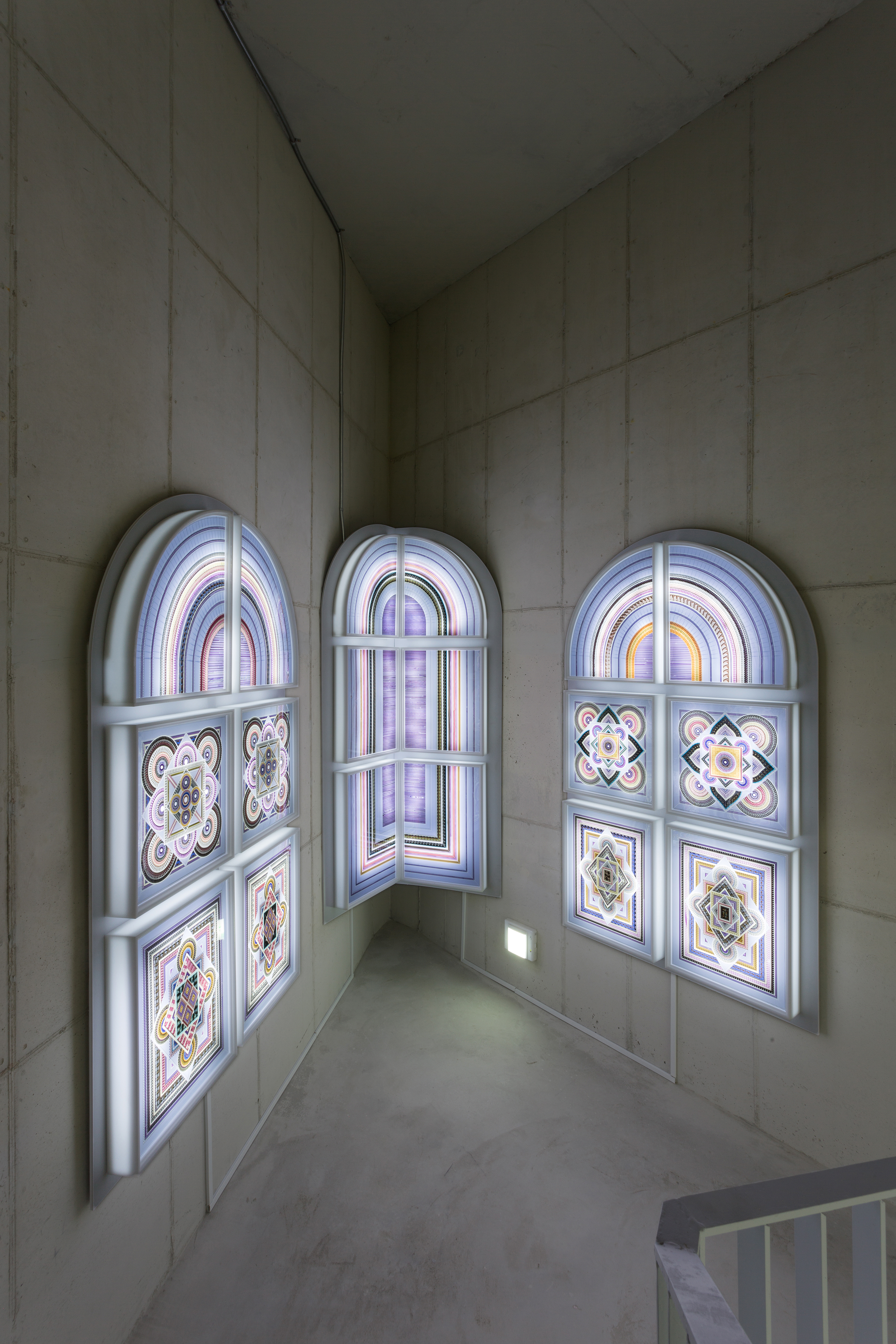 나의 작품 속에는 다양한 역사와 배경 그리고 수많은 사람들의 이야기가 정지된 상태에서 존재한다. 35mm, 16mm, 8mm 속 각각의 집약된 기억들은 시간과 공간을 통하여 새로운 미적 언어로 확장된다. 그 내용들은 나와의 교감을 통하여 재편집되고 새로운 경험을 통하여 나의 언어 안에 새로운 영역으로 존재하게 된 다. 그리고 그 안에서 나 자신의 숨겨진 감성을 찾으려 한다. 이번 작품에서는 성스러움과 세속적인 것이 교차한다. 세상의 수많은 이야기와 인간의 꿈, 욕망이 가득 담긴 영화 필름을 한 곳에 모아 재편집 한 뒤 빛이라는 생 명을 불어 넣어 부활 시킨다. 조명을 사용하여 영화 필름의 화려함은 문의 형태와 조화를 이루며, 공간의 구조를 확장시킨다. 어둠 속에서 필름의 다양하고 화려한 색채들의 은은한 빛은 절묘하게 세속과 경건함을 결합시켜 새로운 감성공간을 만든다.