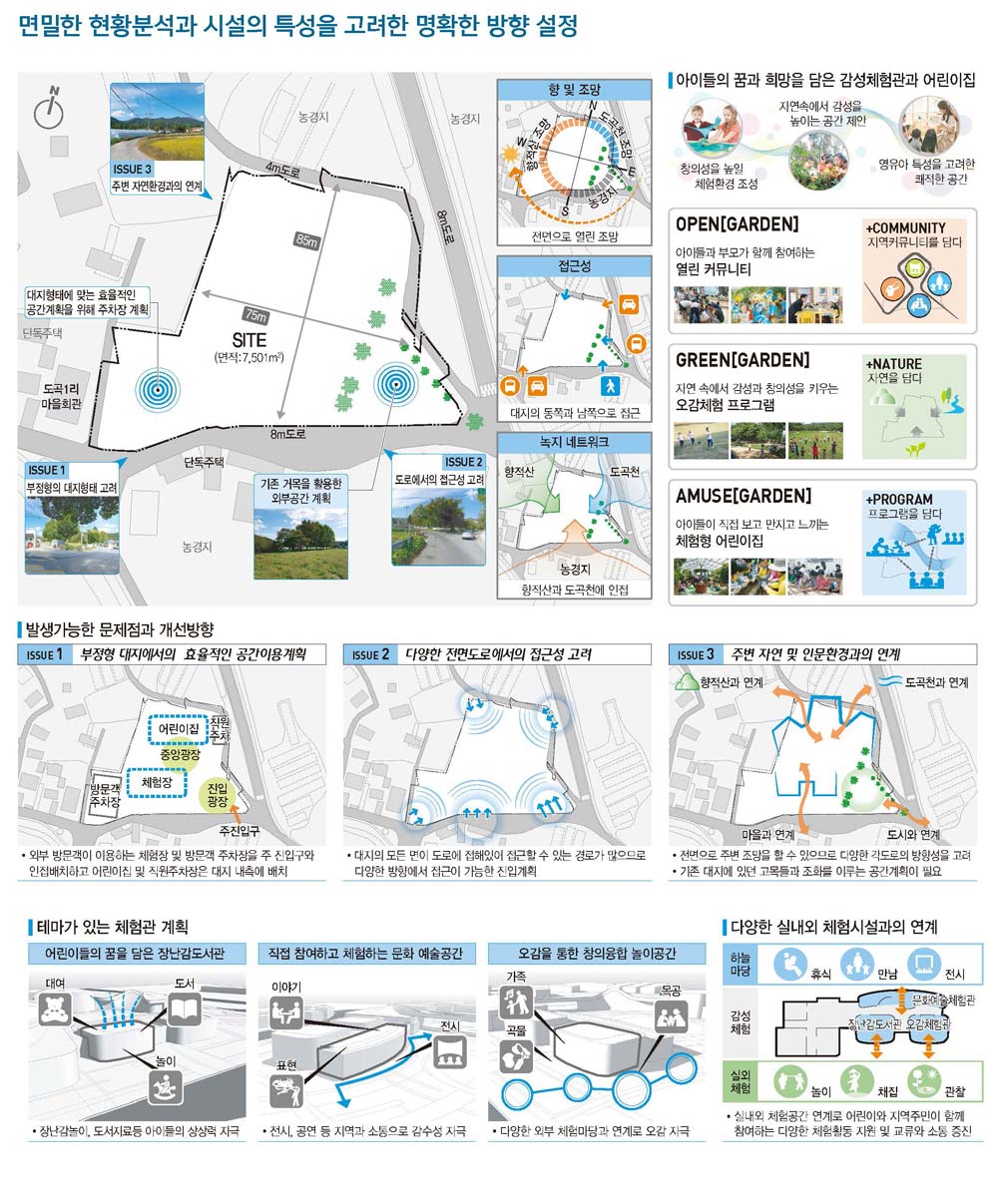 대지는 마을 입구에 위치해 있고, 4면이 도로로 둘러싸인 곳으로 북서측에는 향적산과 대지의 동측에는 도곡천이 위치한다. 우리는 같은 부지 내의 어린이 집과 감성체험장을 조화롭게 구성하여, 주 이용대상인 어린이의 창의성을 향상 시키는 공간을 마련하고자 했다. 또한, 창의적인 공간 연출과 경제성까지 갖춘 균형있는 공간을 짓고자 했다.