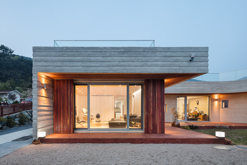 건축주에게 바다는 고향이고 삶의 터전이며 생활이다. 그래서 집은 무 엇보다 바다와의 관계에 가장 큰 비중을 두었다. 바다와 함께 호흡하 는 쉼터가 될 수 있도록 바다를 향해 개방적이고 열려있는 구조로 했 다. 그리고 단층으로 계획하여 후면의 갈대숲과 그 너머의 동망산을 건물의 배경으로 차용했다.