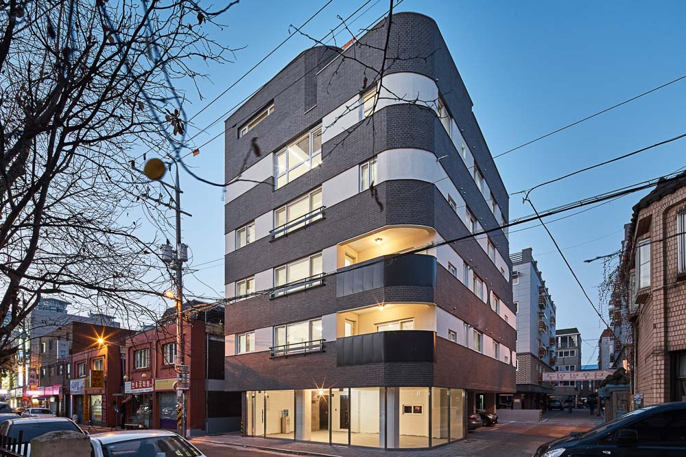 Description of the Work After the cancellation of the long-suspended urban redevelopment, most of the neighbourhood buildings have been changed into stereo-typed multi-family housings. The owner of the project asked to design something out of the stereo-type. The architect intended to make the atmosphere of the neighbourhood more friendly by designing a terrace for each unit, where residents can enjoy the scenery of streets and greet with neighbors. It is also articulated into a curved geometry at the corner according to the characteristics of the site. And it has balconies at the corner of the 2nd and 3rd floors to see streets at both directions. At the north corner, it has the pocket-shaped balconies for the privacy and the more floor areas. Although the floor area of the 5th floor is small, it is a double-spacious loft, where you can go to the terrace garden directly. For the elevation, the windows are located irregularly to avoid monotonous facade, and the continuous and contrasting horizontal strips are designed at the heights of the windows in order to make the consistency with the unique rhythm in the entire building.