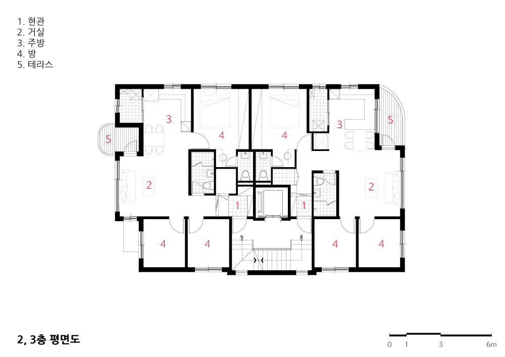 2, 3층 코너에는 양쪽 골목길을 볼 수 있는 발코니를 두었고 북측의 경우 면적과 이웃집과의 프라이버시를 고려해 포켓모양의 발코니를 특성에 맞게 적용했다. 5 층에는 바닥면적은 작지만 다락을 이용한 복층세대를 계획하여 높고 시원한 공 간을 품을 수 있게 했다. 또 동선이 외부 테라스 정원으로 연결되도록 계획했다. 건물의 입면에서 중요한 요소인 창문은 각층의 평면에 따라 최적의 위치에 계 획됐으나 입면에서는 불규칙한 모습으로 나타나게 되는데, 연속적이면서 대비 가 되는 수평띠를 창문높이에 맞춰 디자인함으로써 건물 전체를 인식하는 통일 된 입면과 골목길과 반응하는 특별한 리듬감을 줄 수 있도록 했다.