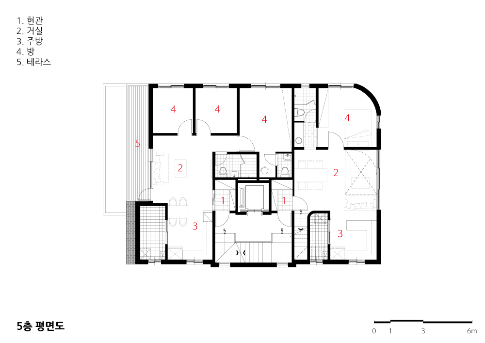 2, 3층 코너에는 양쪽 골목길을 볼 수 있는 발코니를 두었고 북측의 경우 면적과 이웃집과의 프라이버시를 고려해 포켓모양의 발코니를 특성에 맞게 적용했다. 5 층에는 바닥면적은 작지만 다락을 이용한 복층세대를 계획하여 높고 시원한 공 간을 품을 수 있게 했다. 또 동선이 외부 테라스 정원으로 연결되도록 계획했다. 건물의 입면에서 중요한 요소인 창문은 각층의 평면에 따라 최적의 위치에 계 획됐으나 입면에서는 불규칙한 모습으로 나타나게 되는데, 연속적이면서 대비 가 되는 수평띠를 창문높이에 맞춰 디자인함으로써 건물 전체를 인식하는 통일 된 입면과 골목길과 반응하는 특별한 리듬감을 줄 수 있도록 했다.