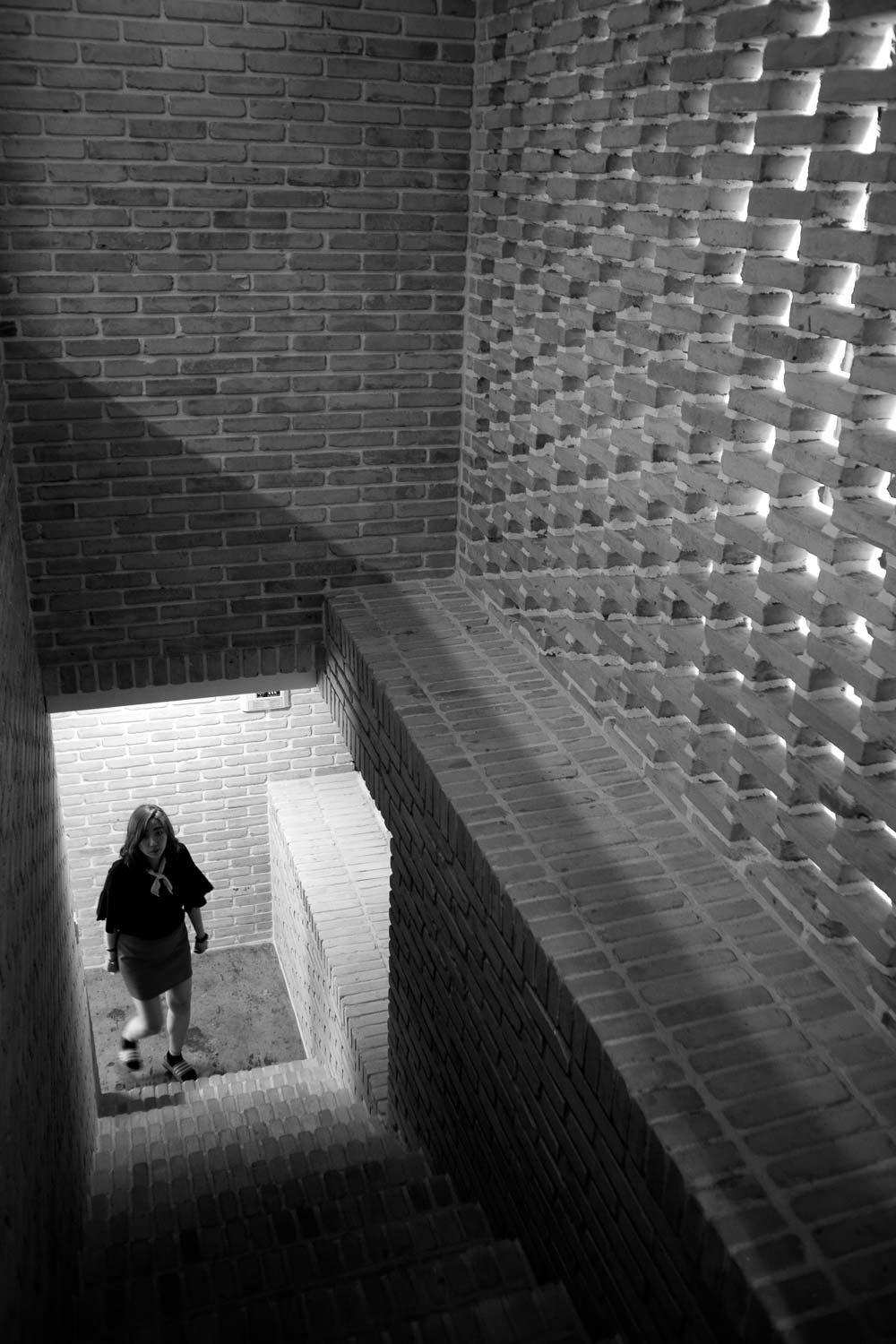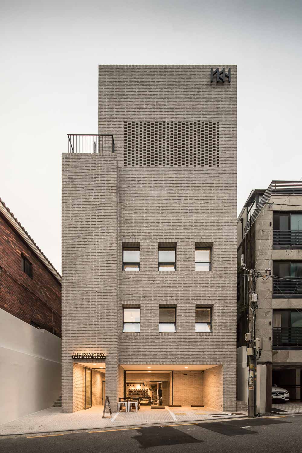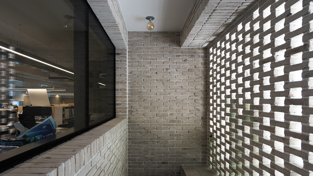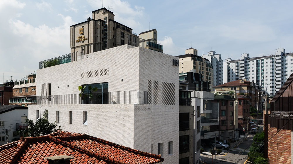 제한된 공사여건을 효과적으로 풀기 위해서 단순한 박스 형태의 매스와 통 일된 마감 재료를 계획했다. 또한 사무실 면적을 최대한 확보하고 유지관리 비를 줄이기 위해서 계단실을 건물 외부로 배치했다. 덕분에 동선을 간결하 게 정리할 수 있었을 뿐만 아니라, 층별로 개별보안을 적용할 수 있게 되면서 보안에도 더 유리해졌다. 건물 전체에 적용된 8만장이 넘는 벽돌들은 한장 한장 직접 선별하여 세척하고 갈아내서 사용했고, 백색몰탈을 사용하여 줄 눈을 최대한 깊게 파냄으로써 고벽돌만의 자연스러운 느낌을 살렸다. 또한, 계단실 외피에 영롱쌓기를 한 백고벽돌들을 활용함으로써 원활한 환기를 가 능하게 함과 동시에 독특하면서도 정갈한 건물 분위기를 연출하고자 했다.
