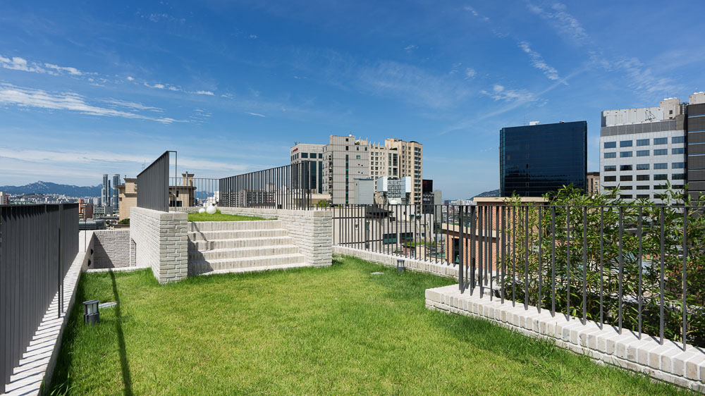 제한된 공사여건을 효과적으로 풀기 위해서 단순한 박스 형태의 매스와 통 일된 마감 재료를 계획했다. 또한 사무실 면적을 최대한 확보하고 유지관리 비를 줄이기 위해서 계단실을 건물 외부로 배치했다. 덕분에 동선을 간결하 게 정리할 수 있었을 뿐만 아니라, 층별로 개별보안을 적용할 수 있게 되면서 보안에도 더 유리해졌다. 건물 전체에 적용된 8만장이 넘는 벽돌들은 한장 한장 직접 선별하여 세척하고 갈아내서 사용했고, 백색몰탈을 사용하여 줄 눈을 최대한 깊게 파냄으로써 고벽돌만의 자연스러운 느낌을 살렸다. 또한, 계단실 외피에 영롱쌓기를 한 백고벽돌들을 활용함으로써 원활한 환기를 가 능하게 함과 동시에 독특하면서도 정갈한 건물 분위기를 연출하고자 했다.