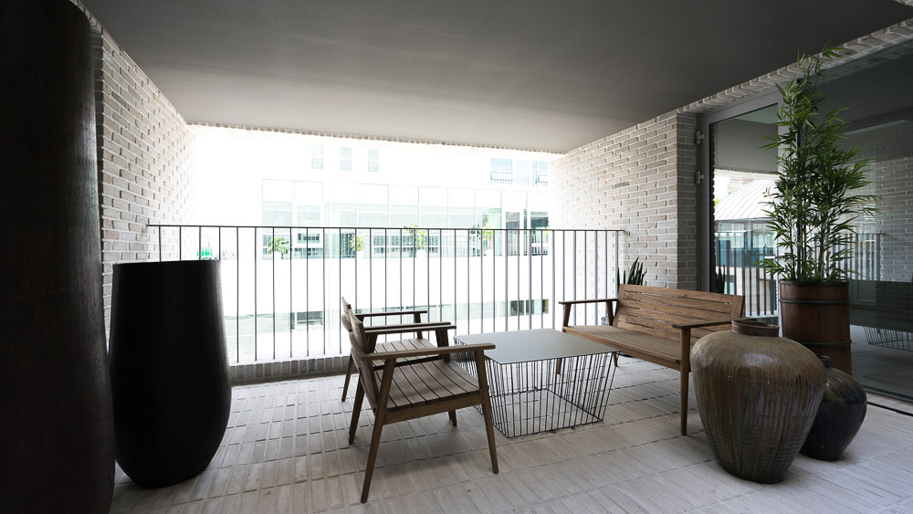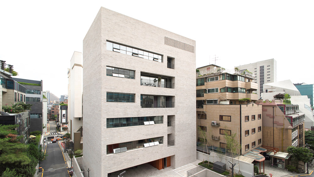 성격이 다른 각각의 업무공간의 프로그램을 층별로 나누고, 필요한 면적 외의 공간을 발코니 등의 외부공간화 하며 비워냈다. 비워낸 공간은 1.5미터 깊이의 발코니로 시작하여 서로 다른 깊이로 입면에서의 입체감을 형성한다. 특히 수 직적으로 교차된 부분을 통해 햇빛과 바람이 통하도록 계획했다. 광고업무 특 성상 보안이 중요하기 때문에 외부인의 출입여부와 업무성격에 따라 층별로 철 저하게 구분되지만 외부의 비워진 공간들을 통해 위 아래층으로의 시각적 소통 이 가능하도록 했다.