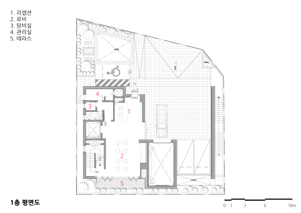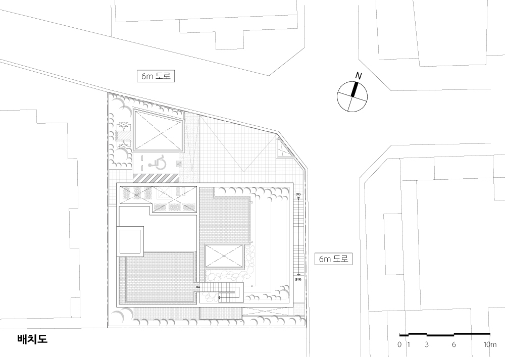 대지는 일조권 사선에 의해 계단형태로 이루어진 건물들을 많이 볼 수 있는 제 3종 일반주거지역에 위치한다. 일조권 사선을 피해 가장 단순한 형태를 의도하 기도 하였지만, 박스형태의 건물은 북측도로와 거리를 두며 충분한 오픈공간을 형성하기도 한다.