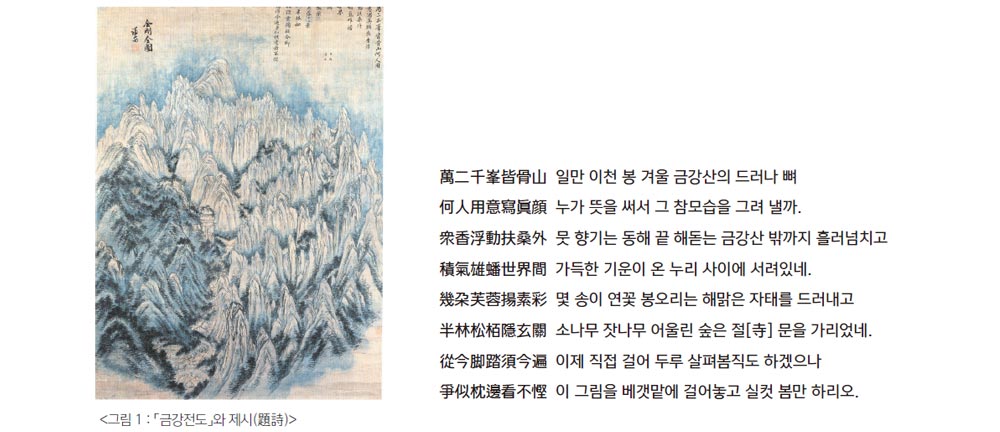 이렇게 저렇게 변화하는 모습을 다 담은 금강산의 참 모습(眞顔)을 한 폭의 그림 으로 그러내기란 참 어려운 일이다. 정선이 “하인용의사진안(何人用意寫眞顔)” 즉 “누가 뜻을 써서 그 참모습을 그려 낼까”라고 말한 이유를 알만하다. 참 모습 (眞顔)이란 ‘물리적 자연 세계’(존재의 세계)의 일이며, 문자와 사유를 활용하 여 그 의미를 포착하는 것(用意)은 ‘인간의 세계’(소유의 세계)의 일이다. 정선의 ‘제시’에서 보여준 문자 부분(=意)과 그 밑의 텅 빈 공간 부분(眞顔)은 서로 다르지만, 이것은 ‘사이(間)=사이 없음(無間)’처럼 서로 맞물려 있는 것이다. 유무 상생(有無相生)의 ‘묘(妙)’한 공간이다. 예컨대 사람이 살아야 할 집이 집으로서 쓸모 있으려면, 즉 생명력을 얻으려면, 방과 창문처럼 텅 빈 공간이 함께 있어야 한다(有之以爲利, 無之以爲用)(왕필본 『노자』11장)