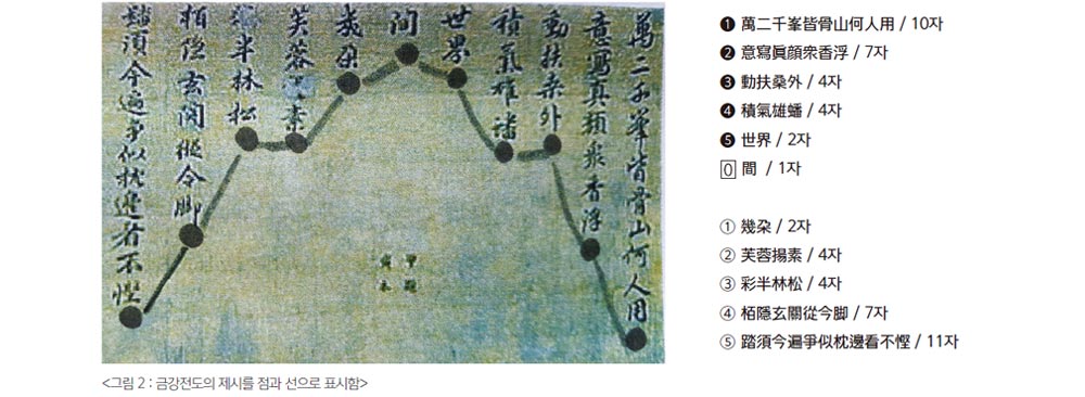 우선 ‘제시’ 56자의 글자 배치 방식을 보자. 열한 줄로 쓰되, 중앙에 ‘사이 간 (間)’( ) 자 한 글자를 놓고, 그 양쪽에 각 5줄 씩 대응시켰다. 그 글자 수는, 10- 11(❶-①), 7-7(❷-②), 4-4(❸-③), 4-4(❹-④), 2-2(❺-⑤) 식으로 딱 맞추었다. 그래서 개골산(즉 겨울 금강산의 드러나 뼈)처럼 ‘간’을 뾰족한 산 봉 오리를 ‘음각(陰刻)’하고 있다. 그런데, 사실 ‘사이 간’이라는 글자는 문자로서 드 러나 있기에 양각(陽刻)이라 할 만 하나, 그 글자는 사물-사건들의 ‘사이’를 의 미하기에 드러나지 않은 공간 즉 ‘사이 없음=무간(無間)’이라는 음각을 붙들고 있다. ‘사이(間)=사이 없음(無間)’이라는 묘한 구조는 하나의 산 봉오리를 만들 어낸다. 이 산 봉오리는 ‘사이(間)=사이 없음(無間)’: ‘글자 부분=글자 없는 부 분’으로 나뉘어져 있지만 사실은 두 세계가 공존하고 있는 것이다.