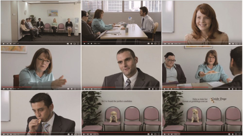 개의 입장에서 보면 어떨까? 반려견이 되는 것이 꼭 행복한 일만은 아닐 수도 있다는 생각이 든다. 원하는 것을 먹지도, 마음대로 짖지도 못하고 내키는 상대와 짝짓기도 못한다. 부모형제와 생이별하여 인간이 쳐놓은 울타리 안에서만 살아야 한다. 사람이라면 절대 선택하지 않을 극한직업이다. 호주의 맹인안내견 서비스 기관인 Guide Dogs NSW/ACT의 광고는 맹인안내견에게 요구되는 무한한 헌신의 자질을 채용인터뷰 형식으로 재미있게 보여주고 있다. 어느 입사 면접장, 대기실에 지원자들이 대기하고 있고 안에서는 면접관의 다소 무리한 질문과 요구가 이어진다.