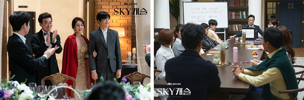 흥미로운 점은 3대째 의사집안이라는 주인공 시어머니의 집은 거대 한옥이다. 왜 한옥으로 설정했을까? 이탈리아 풍경과 한옥 풍경 너무 상반되지 않나? 그런데 공 통점이 있다. 둘 다 일하는 사람을 두지 않으면 관리가 어렵다는 점이다. 단순한 크기의 한옥이 아닌 거대한 규모는 이들이 성취한 성공을 상징하기에 충분하다. 그런 데 왜 주인공들의 공간은 한옥 마을이 아닌 골프장 속 이탈리아 이미지 마을일까? 드라마의 이야기는 이런 현실속의 가상을 연출한 마을에서 전개되는 것 자체가 의미 심장하다. 통제되어 아무나 들어가지 못하는 골프장 마을. 이는 그들만의 세계에 대한 상징이며, 가상의 드라마라는 것을 알려주는 장치이기도 하다. 시청 자들이 몰입해서 보면서도 “그래 이건 드라마야!”라고 생각하지만, 상당한 사실 주의가 스며들어 있는 것은 주인공들의 직업이 0.01%의 재벌이 아니라 전문직 직업을 가진 사람들이라는 점이다. 의사나 변호사가 흔한 직업은 아니지만, 그렇 다고 손에 닿지 않는 직업도 아니다. 어쩌면 한국 입시의 상징적 장소인 학군 좋 은 서울 강남 대치동의 치열한 입시 분위기와 맞물려 있다. 대치동 학군이 성장 한 이유는 비교적 자기 힘으로 성장한 전문직 또는 대기업 직원들의 주거지였다 는 점이다. 이들은 교육으로 기회를 부여잡은 이들이고, 이들의 학력 사다리를 통 한 경제적 풍요를 자식들에게 전수하려는 피나는 노력을 말한다. 성북동이나 한 남동, 압구정동 학군이 유명하지 않은 이유는 이들은 굳이 피나는 노력을 하지 않아도, 전문직이 아니어도 자연스럽게 기업을 물려받는 금수저 동네라는 점이 다. 이에 반해서 대치동의 노력은 그렇지 않다. 그래서 드라마 스카이 캐슬의 동 네는 연출되고, 흉내 낸 것들로 가득하다. 그것은 욕망이다. 욕망을 드러내는 장 면들은 곳곳에 드러나 있다. 거의 호텔 로비 수준의 높은 층고는 그들의 끝없는 욕망을 말하는 장치이며, 명암이 드러나는 빛의 구성은 은밀하게 정보(그들만의 수단을 말하는)를 교류하는 상황 설명이다. 사실 높은 천장을 일반 가정에서 관 리한다는 점은 엄청난 수고가 들어가서 보통의 가정은 불가능하다.