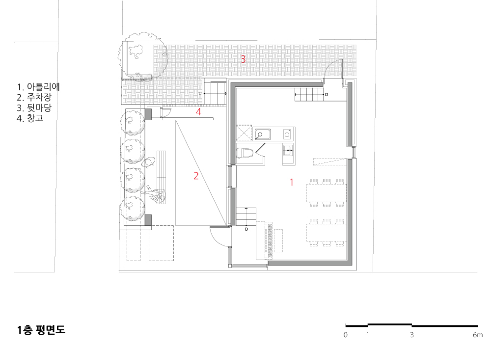집의 공간 구성은 가족 구성원들이 꿈꾸던 삶의 모습을 담아낼 수 있게 맞춤형 으로 설계됐다. 어려서부터 미술을 전공한 화가가 작품활동을 지속할 수 있도 록 마련된 아뜰리에 공간, 좁은 대지에서 최대한 개방적인 내·외부공간을 구현 하기 위해 설치된 가벽과 복층 공간, 아이가 자라면서 점차 용도와 형태를 달 리하며 쓰이게 될 다목적 공간, 근처 푸른길 공원과 멀리 무등산을 조망하고 옥상의 활용도를 높여 줄 그늘 공간 등은 이 조밀한 집의 가장 특징적인 부분 이다.