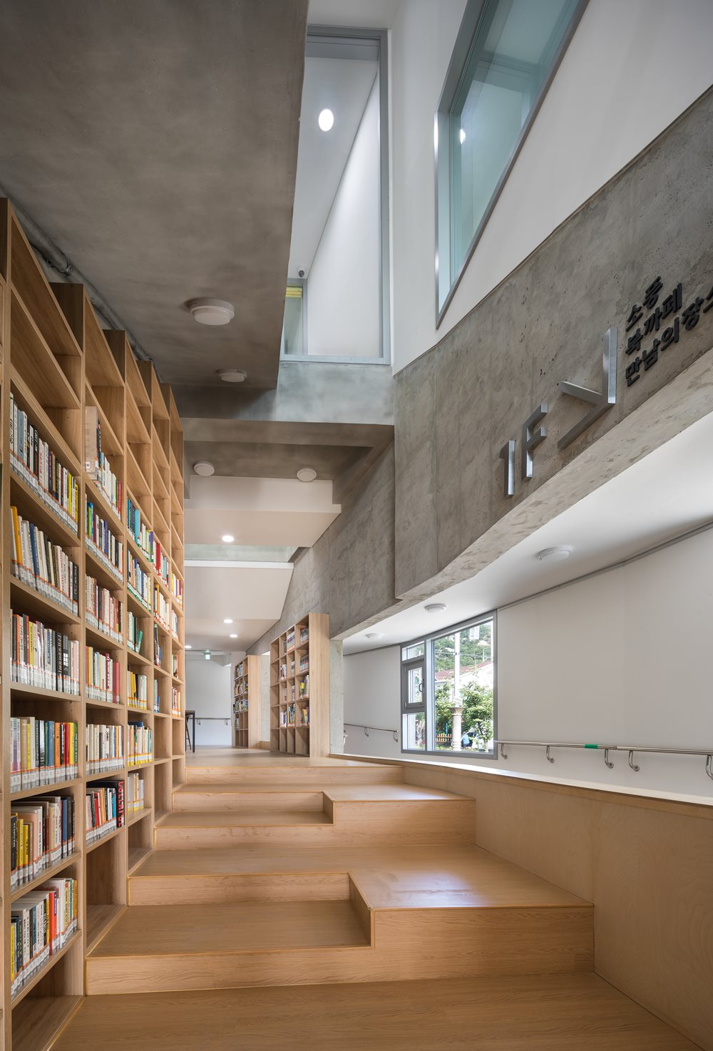 An important method for realizing a borderless community is to change the recognition of spaces separated by layers from the maximum level of moving level to the delicate stage of moving level, through the breakup of the existing core method. In small architecture, the vertical movement line of core has changed into programmed space such as book shelves, resting places, and performance seats. This becomes an important architectural strategy where a functional staircase develops into the space of programs and the continuous and extensive community without boundaries. It suggests the new discovery of a ramp for the disabled. Under the provisions of Building Act, a ramp for disabled people is not included in the building area and the total floor area. We extended this legal basis to the design motif. Generally, the ramps, elevators, or lifts for the disabled are installed at some sections or entrances. Surak Happy Power Plant makes ‘Sopunggil' which is used by everyone and for multiple purposes, instead of using the purpose and the name of a ramp for the disabled, by creating a new concept of a multipurpose ramp used as a poet Cheon Sang-Byeong’s gallery, a gallery of works of local residents, the extension space of a performance hall, and the extension space of a book cafe. Sopunggil is naturally connected to the third-floor rooftop through the first floor and the second floor, which induces borderless community space and a lot of interactive communication by users’ intention and choice. Sopunggil is a means of movement and an extension space for various communities and strengthens each other’s relationship. The scenery of the people on Sopunggil is small but contains a natural and cozy sensibility that can not be seen anywhere. The image of a simple Sopunggil is poet Cheon Sang-Byeong’s longing for the world of innocence, nature and humanistic works, and the way of imagination.