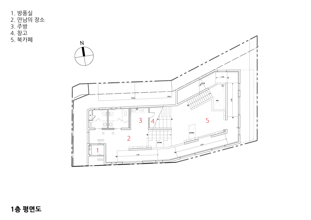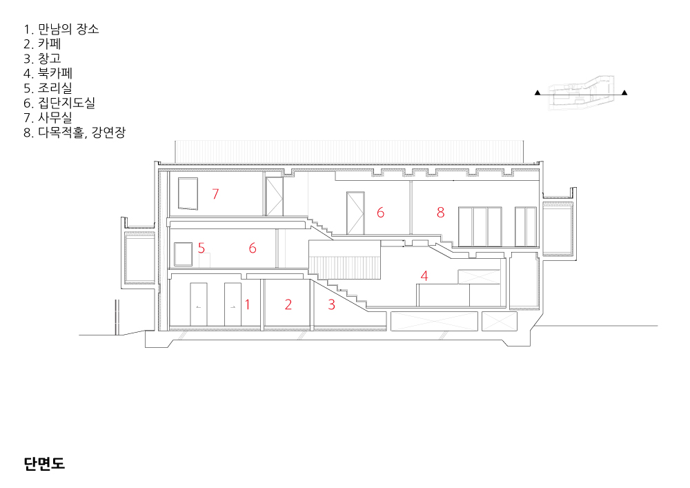 작은 건축이라고 최소의 프로그램만 적용시키지 않고 이 지역의 특성상 작고 다양한 프로그램들이 공존하는 것이 우선이었다. 수락발전소의 용도 또한 커 뮤니티 공간의 독립성보다는 다양한 계층의 주민들이 서로 마주보고 인사하고 서로 간의 적당한 인지와 자연스러운 소음·행동이 서로 어울리는 살아있는 작 은 커뮤니티가 되기를 기대했다. 작은 땅에 작은 건축의 물리적 환경을 극복하는 공간적 전략은 경계 없는 커뮤니티 공간으로 발전된다. 로비, 천상병 소풍 길, 북카페, 공연장, 집단 교육실 등은 고정된 벽을 이용한 단절이 아닌 서로 간 의 소통으로 확장된다. 사용자의 목적과 이유에 따라 공간의 규모와 사용성이 확정되는 가변적 환경을 설정함으로써 프로그램간의 현실적 소통이 무엇보다 중요한 경계 없는 커뮤니티를 제안했다.