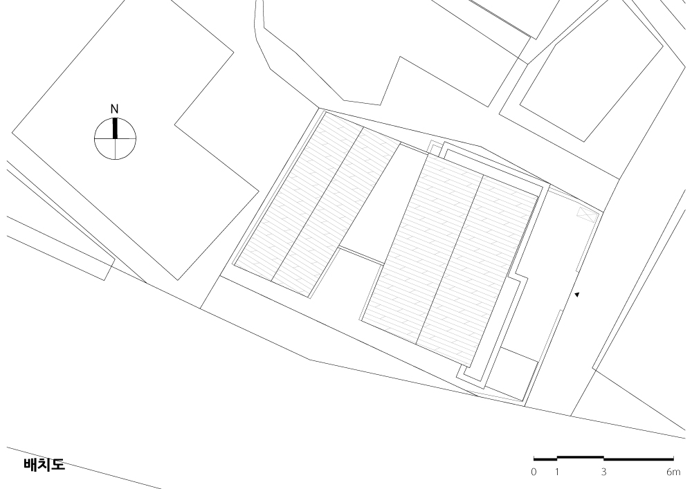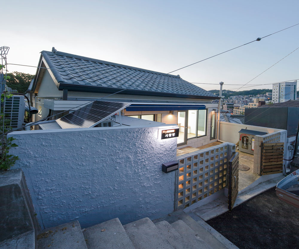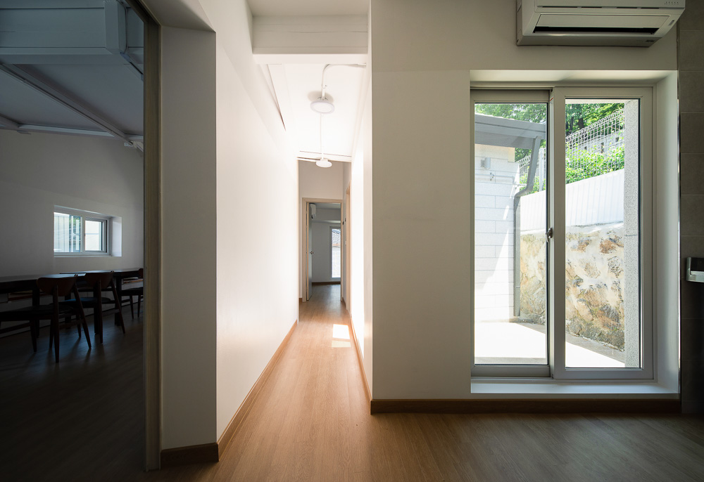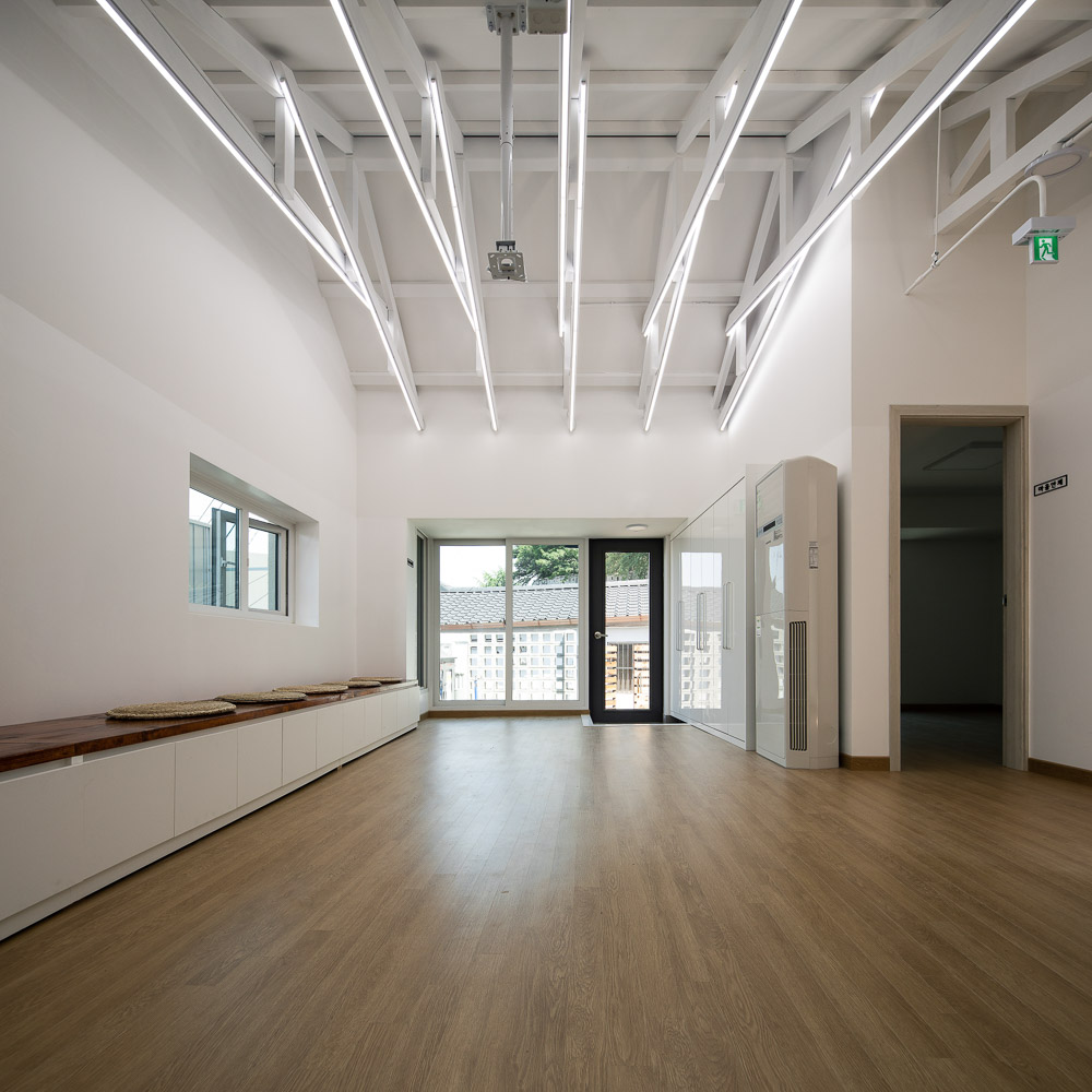 As the regeneration project started, four facilities for local residents (Sarangbang, Masil, Ar t Studio, Ar t Exhibition Hall) wer e planned in the site adjacent t o the Hanyang Wall. I n order t o preserve the existing housing type, we decided t o remodel the existing residential buildings instead of building a new ones. Among them, Sarangbang is a key facility for communication and gatherings of the residents. This building has been extended and expanded for a long time. When planning remodeling, we tried t o keep this shape that has changed over time as much as possible. In particular, we left the shape of the building, which had become a mass, and two leanto roofs as if they were sharing 'daily life together'. In choosing materials, we wanted it t o be a familiar building tha t seems t o have long existed, b y using cement tiles, granite frosted finish, and timber that were already in the existing building.