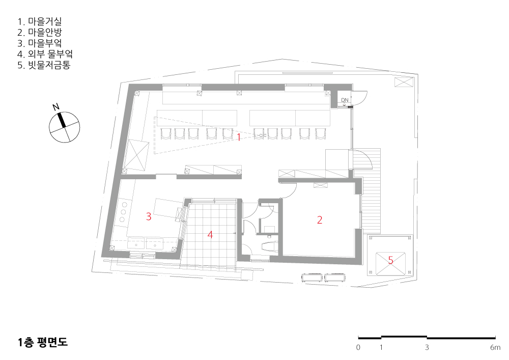 This project reflects the worries about a 'daily space' of the residents, not a visitor-oriented non-daily event space. It is hoped that Sarangbang will be a place for communication voluntarily led b y the residents as a site o f living in village communities. W e also hope that it will be a place of sharing wher e they car e and complement each other, while spending days together with neighbors and having various stories of daily life.