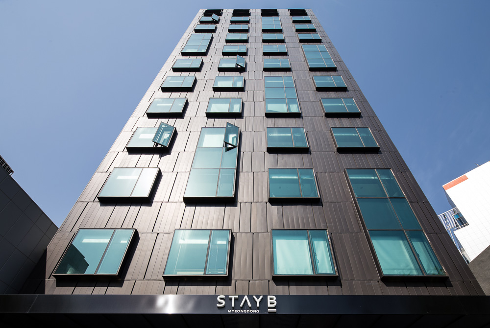 Stay B Hotel is located in the center of Myeong-dong. It is characterized by its very irregular site, which ultimately has a major influence on the irregular shape of the building.