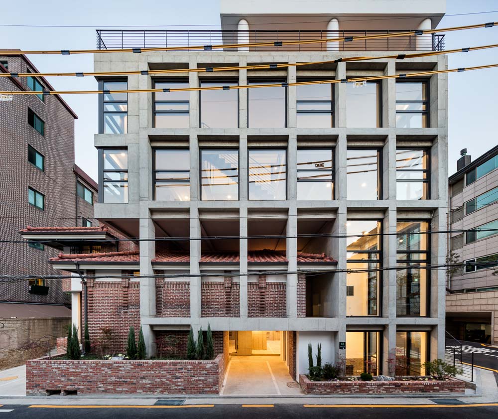 HANNAH HAUS(Pre&Schematic designed b y Jong Seok Kim at COOM PARTNERS) - presents a new form of recyclable alternatives which maximizes spaces and commercial potential, simultaneously minimizes the psychological disunity b y embracing the passage of time. The general aim of typical recyclable alternatives is t o fix an existing old building and t o pursue a maximum profit by enlarging it out of fulfilling the maximum volume and the coverage ratio. On the contrary the HANNAH HAUS not only takes advantages of this substantial condition but also narrows the interval embedded within 37 years. For instance, the aesthetics of simplicity and a sense of balance and harmony, transforms the space int o a very flexible space. The new form of building keeps the scarlet-coloured roof tiles as well as the landscape gardening space i n order t o imply a trace o f time. The architectural decision can be also understood as a creative and spatial endeavor in order to minimize a sense of emotional anxiety while maximizing both the height and the scale. The eye-catching architecture located in Seorae Maeul(Seorae French Village in Seoul) consists of a large scale of concrete building including 2 basements and 6 floors: 25 meters in height.